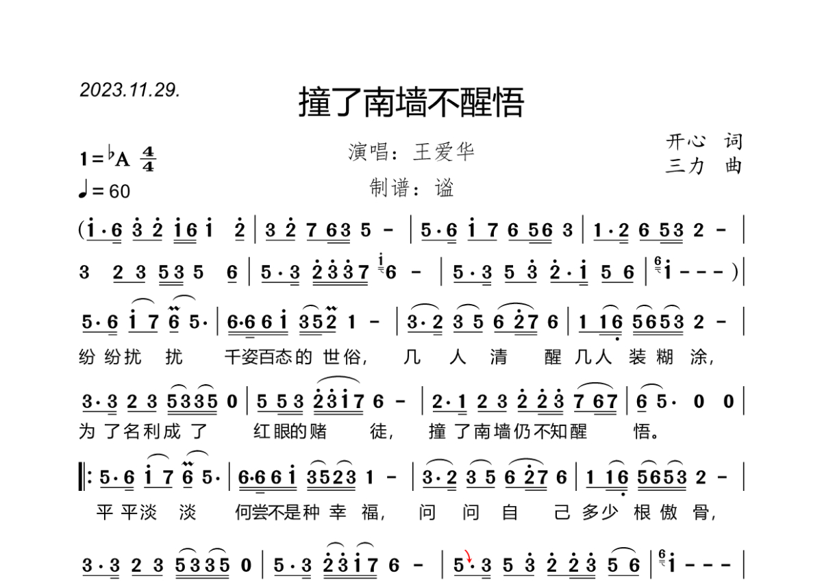 《撞了南墙不醒悟》是王爱华演唱的一首歌曲,拍号为4/4拍,歌曲速度为每分钟60拍,这份简谱共有一张高清图谱,图谱由 @谧 编配上传王爱华演唱的《撞了南墙不醒悟》,原版完整简谱,2023.11.29.发行,bA调,4/4拍,速度60,谧精心制谱,共1页。