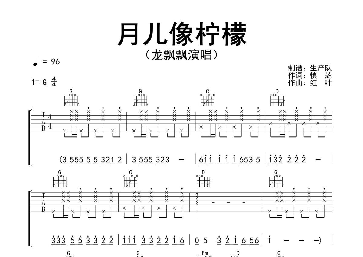 龙飘飘《月儿像柠檬》吉他谱 - G调弹唱六线谱 - 精编完美版