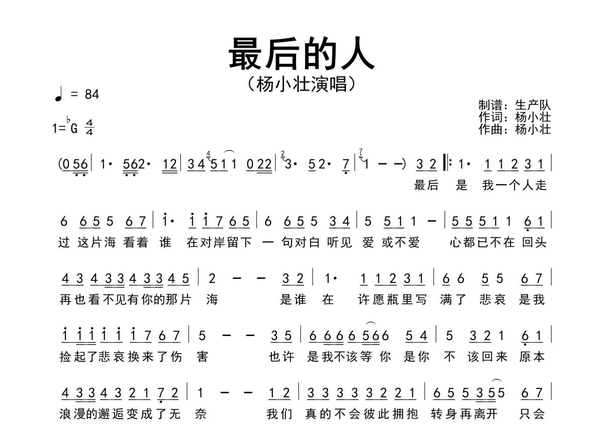 《最后的人》是杨小壮演唱的一首歌曲,原版简谱,拍号为4/4拍,歌曲速度为每分钟84拍,这份简谱共有一张高清图谱,图谱由 @生产队 编配上传杨小壮作词、作曲并演唱的歌曲《最后的人》原版简谱,精准的前奏、间奏、尾奏solo编配。
