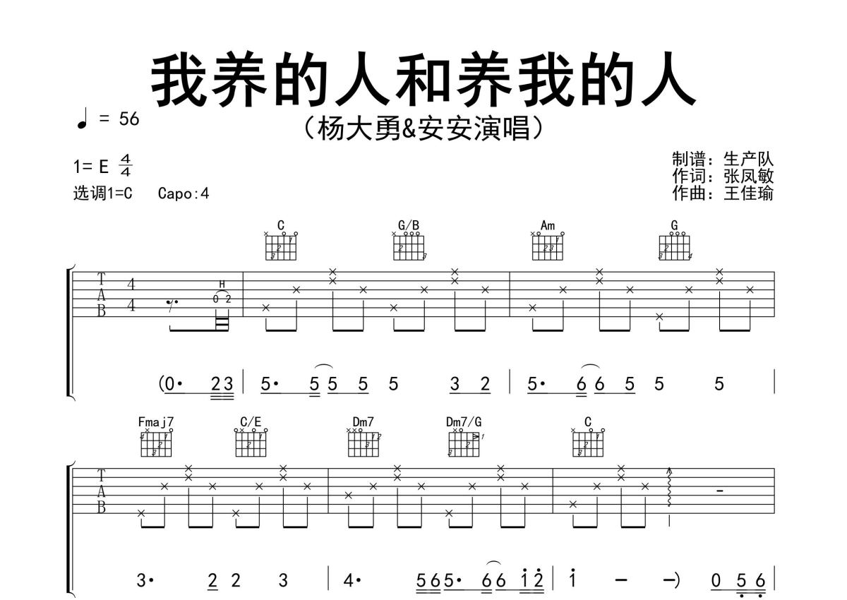 《我养的人和养我的人(对唱版)》是对唱版演唱的一首歌曲,精编完美版,拍号为4/4拍,歌曲速度为每分钟56拍,歌曲原调为E调,但由于原调指法比较难,为了方便弹奏,本吉他谱采用的是C调指法编配,变调夹4品弹奏即为原调,当然也可以根据自己的音域改变变调夹位置,或者通过改变和弦调性,以方便自己弹奏,这份吉他谱共有三张高清图谱,图谱由 @生产队 编配上传,图谱使用六线谱编配,包含吉他和弦指法、简谱以及歌词部分,使用这份我养的人和养我的人(对唱版)吉他谱,可以让你更加方便地掌握这首歌曲的弹唱技巧,快来尝试吧。杨大勇&安安演唱的歌曲《我养的人和养我的人(对唱版)》原版吉他谱,完整的前奏、间奏、尾奏solo编配,精编完美版,非常动听的歌曲,值得推荐。
