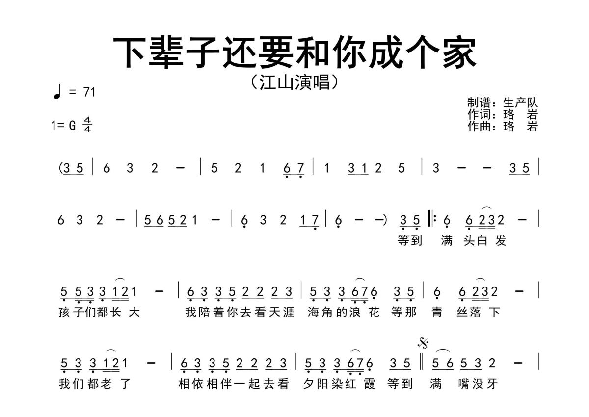 《下辈子还要和你成个家》是江山演唱的一首歌曲,原版简谱,拍号为4/4拍,歌曲速度为每分钟71拍,这份简谱共有一张高清图谱,图谱由 @生产队 编配上传江山演唱的歌曲《下辈子还要和你成个家》原版简谱,完整的前奏、间奏、尾奏solo编配。