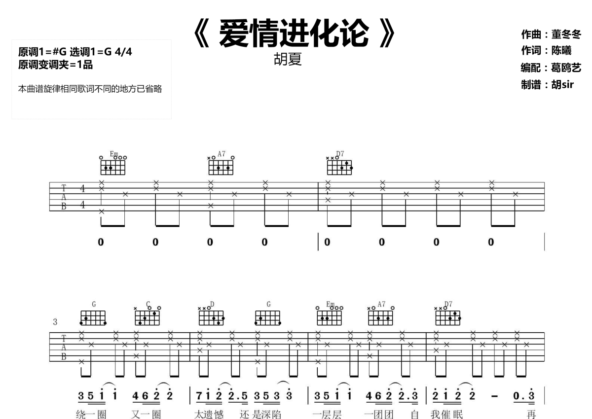《爱情进化论》是胡夏演唱的一首歌曲,本吉他谱采用的是G调指法编配,这份吉他谱共有两张高清图谱,图谱由 @胡sir音乐 编配上传,图谱使用六线谱编配,包含吉他和弦指法、简谱以及歌词部分,使用这份爱情进化论吉他谱,可以让你更加方便地掌握这首歌曲的弹唱技巧,快来尝试吧。胡夏为电视剧《爱情进化论》所作的同名歌曲《爱情进化论》吉他谱分享,变调夹夹第一品G调指法版。其实所谓的“爱情进化论”就是在一个进展的时空中,不断往对方心里走的过程,在爱情中彼此进化成更好的人。胡夏清澈、温暖的嗓音将每个人的爱情进阶过程娓娓道来。