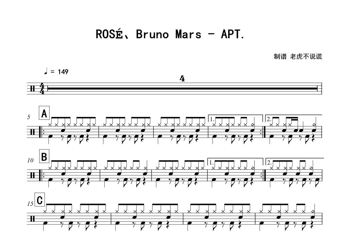 《APT》是ROSÉ、Bruno Mars演唱的一首歌曲,拍号为4/4拍,歌曲速度为每分钟149拍,这份架子鼓谱共有两张高清图谱,图谱由 @老虎不说谎 编配上传,图谱使用五线谱编配,使用这份APT架子鼓谱,你将能够轻松地敲打出这首ROSÉ、Bruno Mars的APT,快来尝试吧。