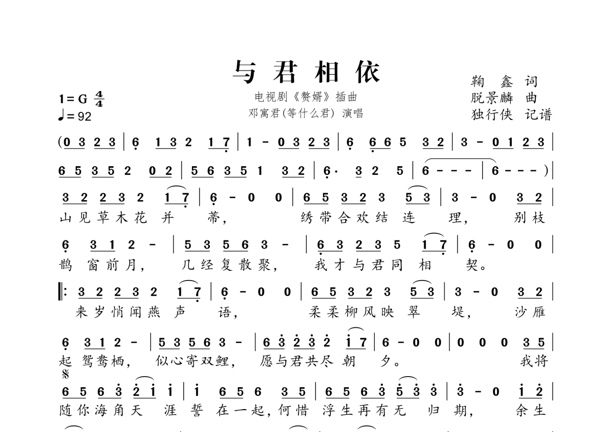 《与君相依》是等什么君演唱的一首歌曲,拍号为4/4拍,歌曲速度为每分钟91拍,这份简谱共有一张高清图谱,图谱由 @独行侠 编配上传。