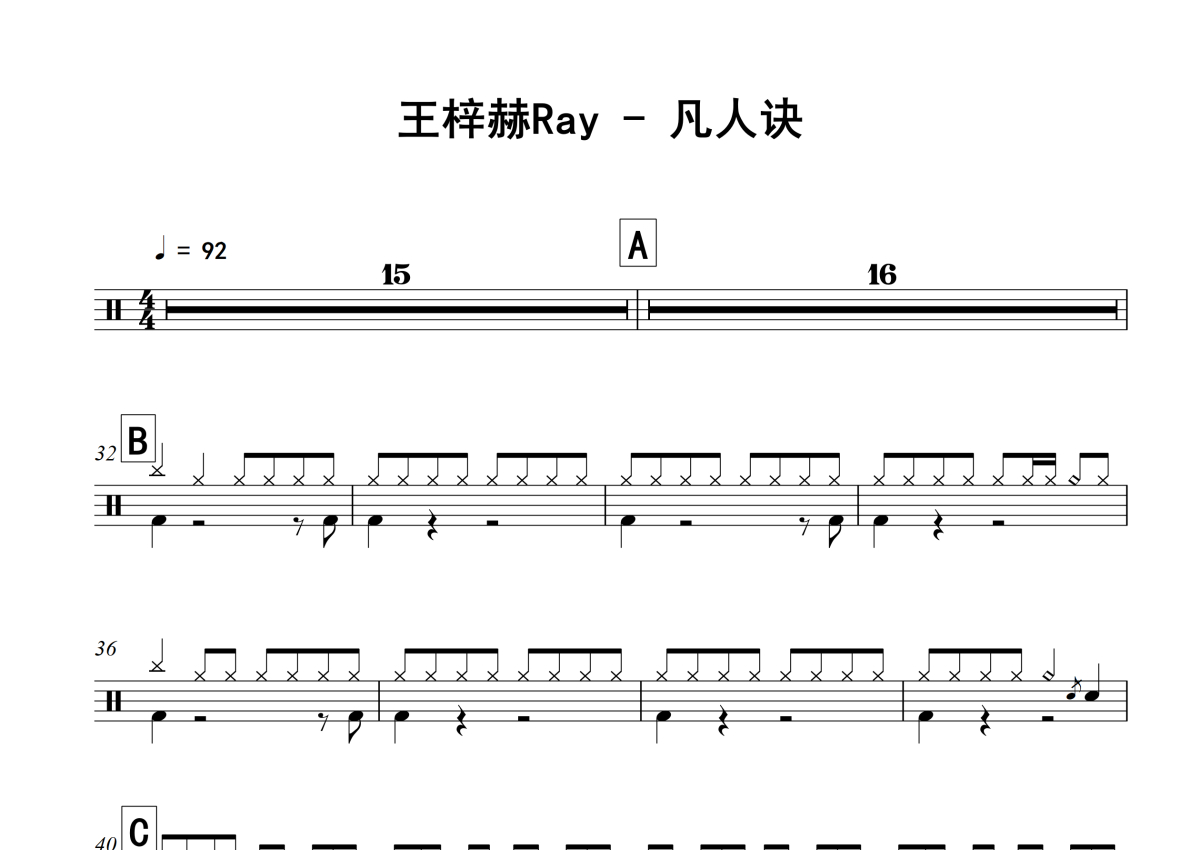 《凡人诀》是王梓赫Ray演唱的一首歌曲,拍号为4/4拍,歌曲速度为每分钟92拍,这份架子鼓谱共有三张高清图谱,图谱由 @老虎不说谎 编配上传,图谱使用五线谱编配,使用这份凡人诀架子鼓谱,你将能够轻松地敲打出这首王梓赫Ray的凡人诀,快来尝试吧。