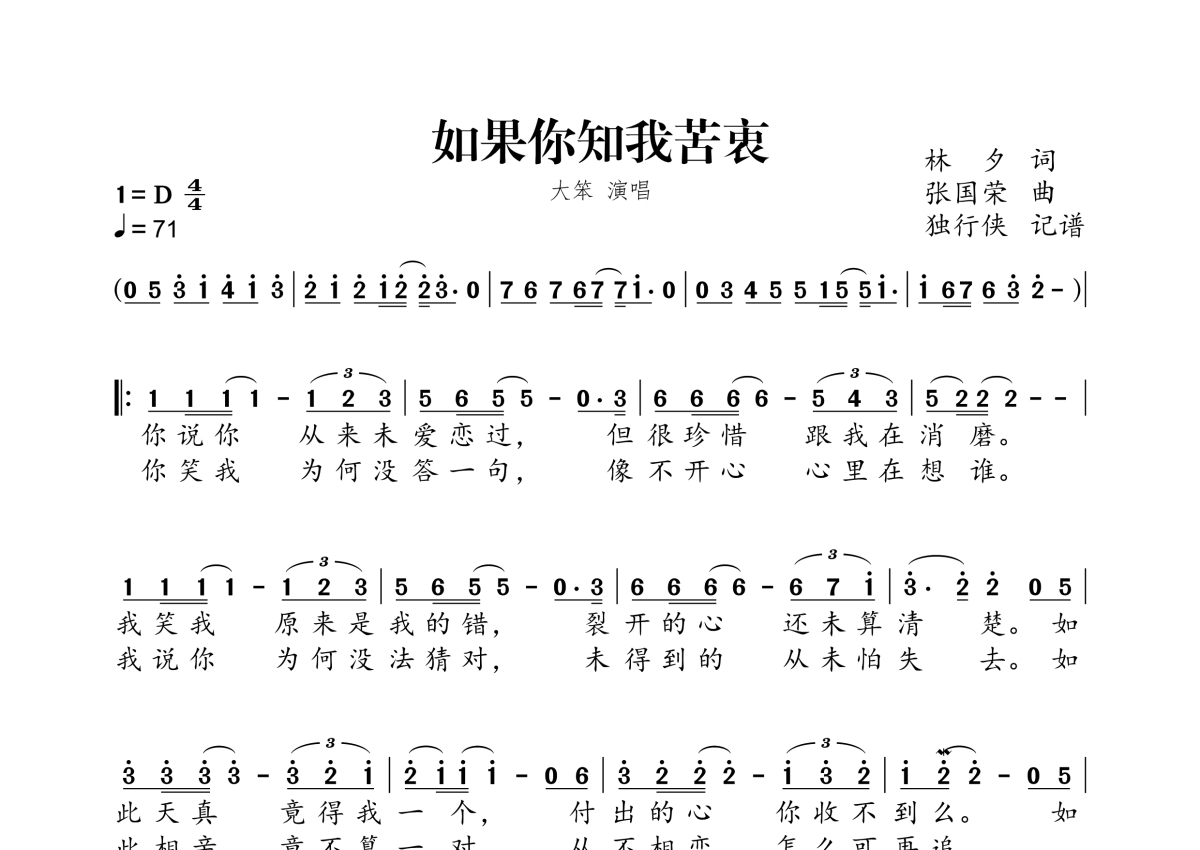 《如果你知我苦衷》是大笨演唱的一首歌曲,拍号为4/4拍,歌曲速度为每分钟71拍,这份简谱共有一张高清图谱,图谱由 @独行侠 编配上传。