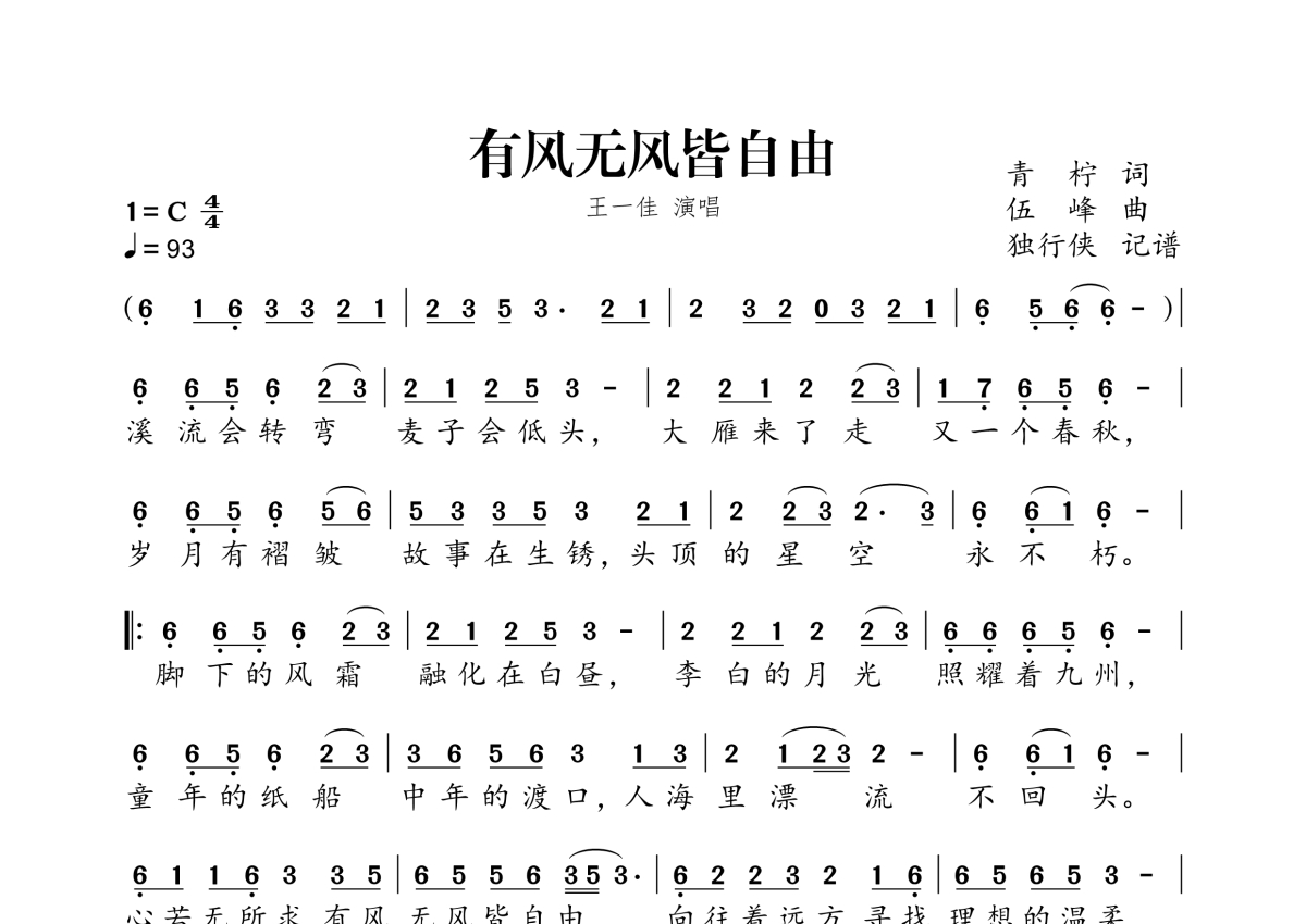 《有风无风皆自由》是王一佳演唱的一首歌曲,拍号为4/4拍,歌曲速度为每分钟93拍,这份简谱共有一张高清图谱,图谱由 @独行侠 编配上传。