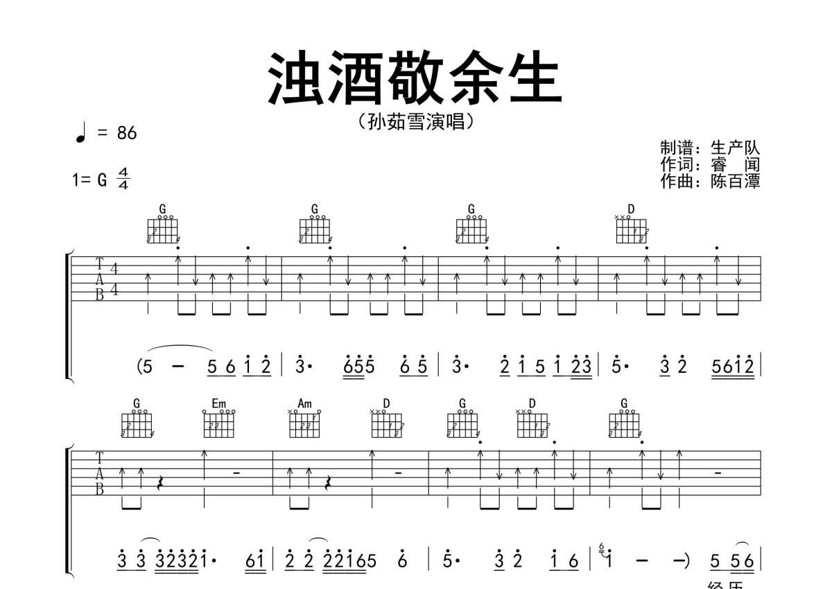 《浊酒敬余生》是孙茹雪演唱的一首歌曲,精编完美版,拍号为4/4拍,歌曲速度为每分钟86拍,歌曲原调为G调,本吉他谱采用的是G调指法编配,演奏时不需要使用变调夹即为原调,这份吉他谱共有三张高清图谱,图谱由 @生产队 编配上传,图谱使用六线谱编配,包含吉他和弦指法、简谱以及歌词部分,使用这份浊酒敬余生吉他谱,可以让你更加方便地掌握这首歌曲的弹唱技巧,快来尝试吧。孙茹雪演唱的歌曲《浊酒敬余生》原版吉他谱,完整的前奏、间奏、尾奏solo编配,精编完美版,值得推荐!。
