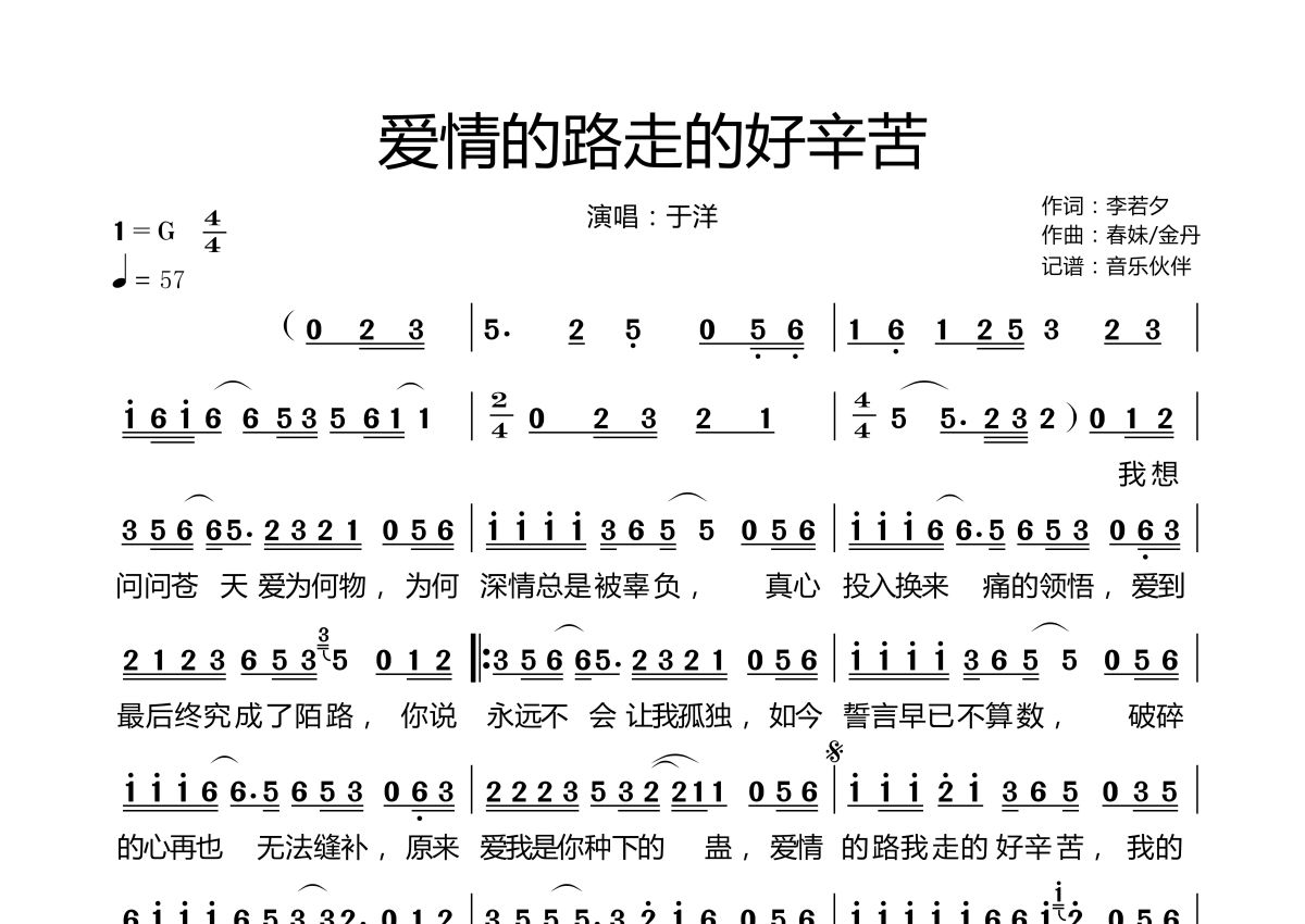 《爱情的路走的好辛苦》是于洋演唱的一首歌曲,拍号为4/4拍,歌曲速度为每分钟57拍,这份简谱共有一张高清图谱,图谱由 @音乐伙伴 编配上传。
