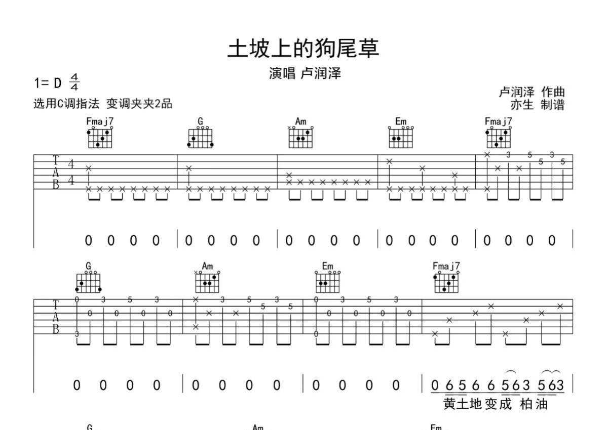 《土坡上的狗尾草》是卢润泽演唱的一首歌曲,拍号为4/4拍,歌曲原调为D调,但由于原调指法比较难,为了方便弹奏,本吉他谱采用的是C调指法编配,变调夹2品弹奏即为原调,当然也可以根据自己的音域改变变调夹位置,或者通过改变和弦调性,以方便自己弹奏,这份吉他谱共有四张高清图谱,图谱由 @亦生 编配上传,图谱使用六线谱编配,包含吉他和弦指法、简谱以及歌词部分,使用这份土坡上的狗尾草吉他谱,可以让你更加方便地掌握这首歌曲的弹唱技巧,快来尝试吧。