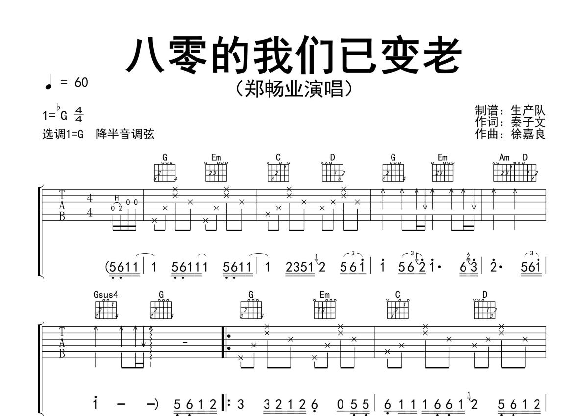 《八零的我们已变老》是郑畅业演唱的一首歌曲,精编完美版,拍号为4/4拍,歌曲速度为每分钟60拍,歌曲原调为Gb调,但由于原调指法比较难,为了方便弹奏,本吉他谱采用的是G调指法编配,降半音调弦弹奏即为原调,当然也可以根据自己的音域决定是否调弦,这份吉他谱共有两张高清图谱,图谱由 @生产队 编配上传,图谱使用六线谱编配,包含吉他和弦指法、简谱以及歌词部分,使用这份八零的我们已变老吉他谱,可以让你更加方便地掌握这首歌曲的弹唱技巧,快来尝试吧。郑畅业演唱的歌曲《八零的我们已变老》原版吉他谱,完整的前奏、间奏、尾奏solo编配。