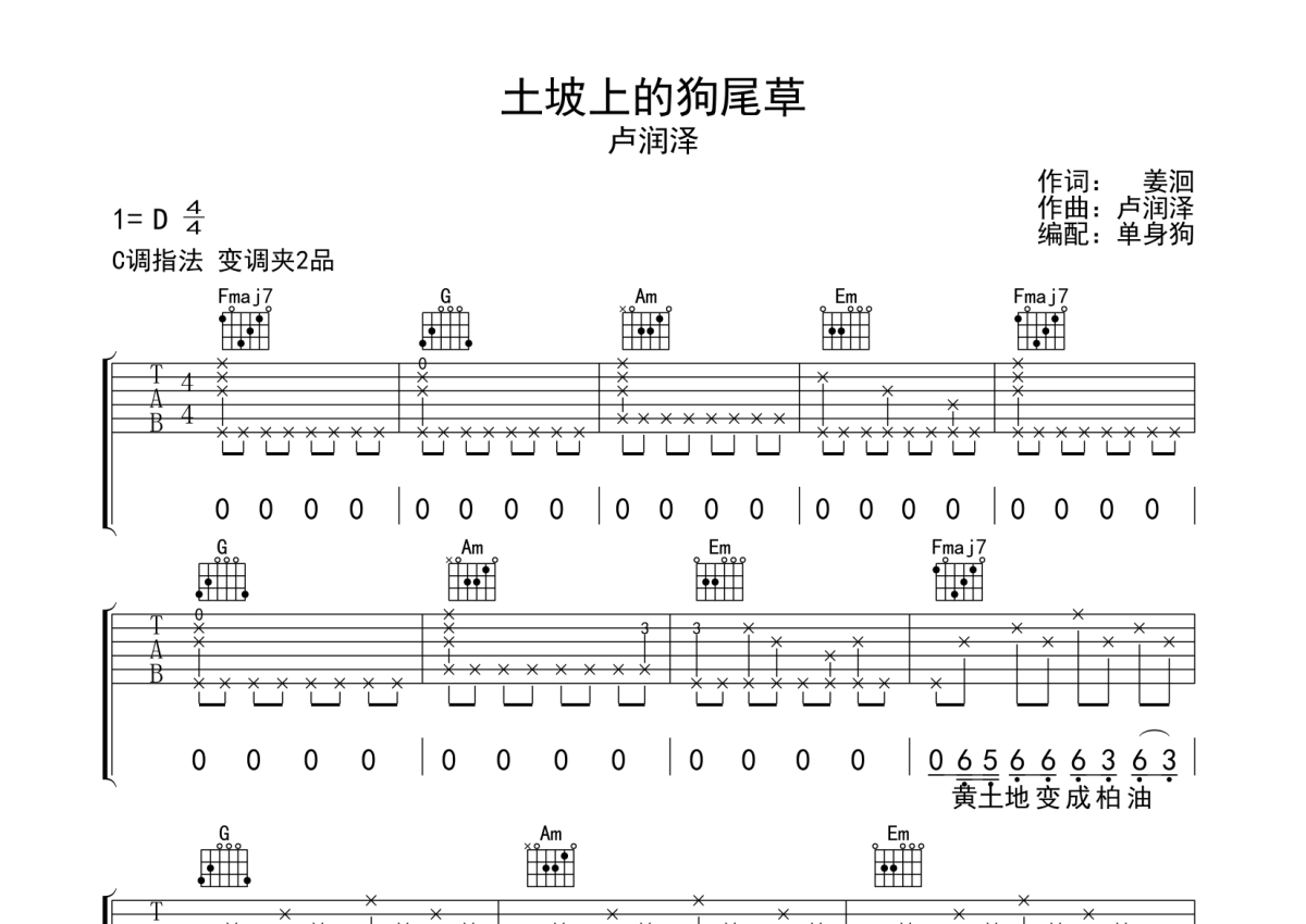 《土坡上的狗尾草》吉他谱 - 卢润泽 - C调弹唱六线谱