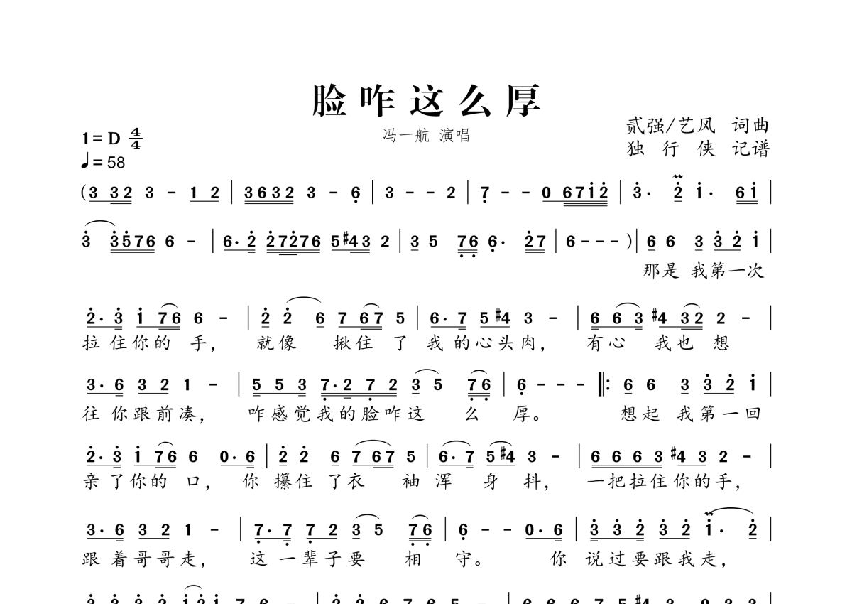 《脸咋这么厚》是冯一航演唱的一首歌曲,拍号为4/4拍,歌曲速度为每分钟58拍,这份简谱共有一张高清图谱,图谱由 @独行侠 编配上传。
