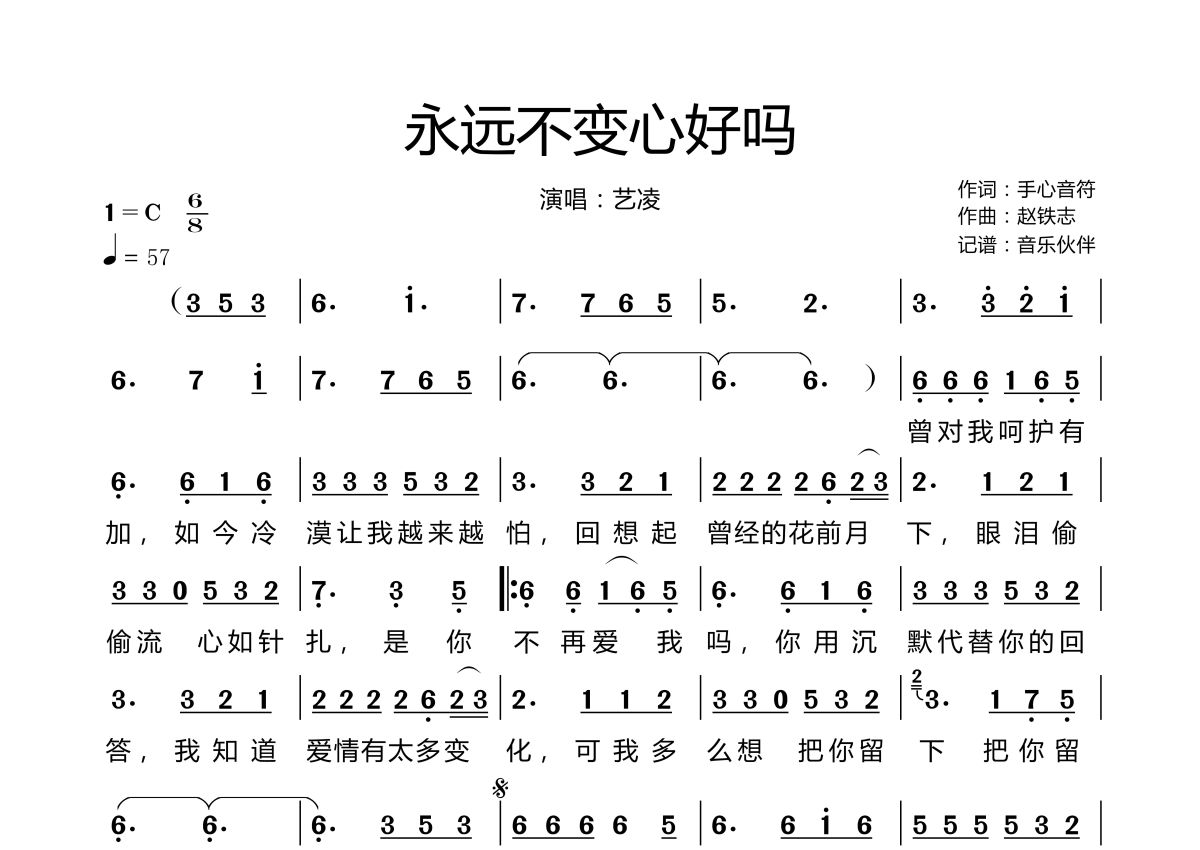 《永远不变心好吗》是艺凌演唱的一首歌曲,拍号为6/8拍,歌曲速度为每分钟57拍,这份简谱共有一张高清图谱,图谱由 @音乐伙伴 编配上传。