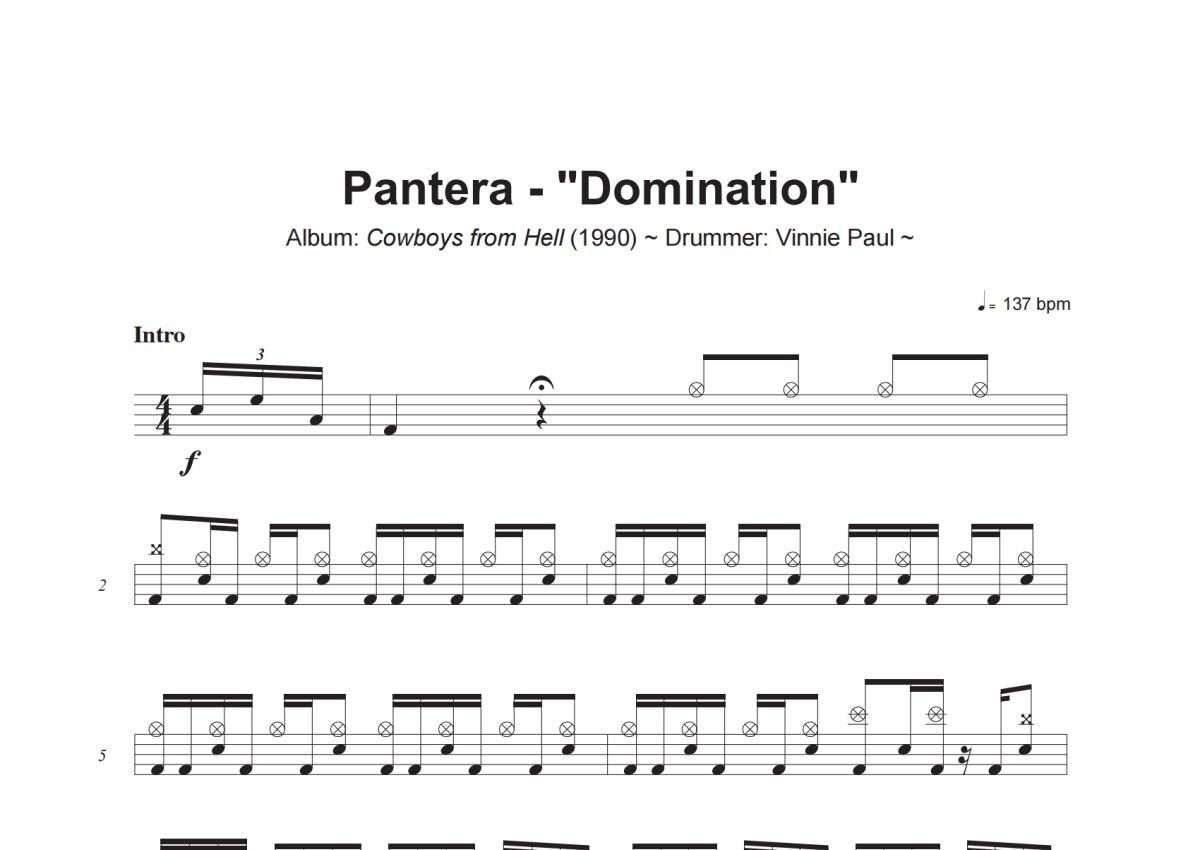 《Domination》是Pantera演唱的一首歌曲,这份架子鼓谱共有九张高清图谱,图谱由 @庄颜 编配上传,图谱使用五线谱编配,使用这份Domination架子鼓谱,你将能够轻松地敲打出这首Pantera的Domination,快来尝试吧。