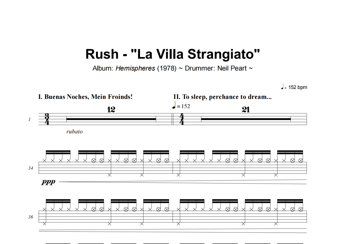 《La Villa Strangiato》是Rush演唱的一首歌曲,这份架子鼓谱共有十六张高清图谱,图谱由 @庄颜 编配上传,图谱使用五线谱编配,使用这份La Villa Strangiato架子鼓谱,你将能够轻松地敲打出这首Rush的La Villa Strangiato,快来尝试吧。