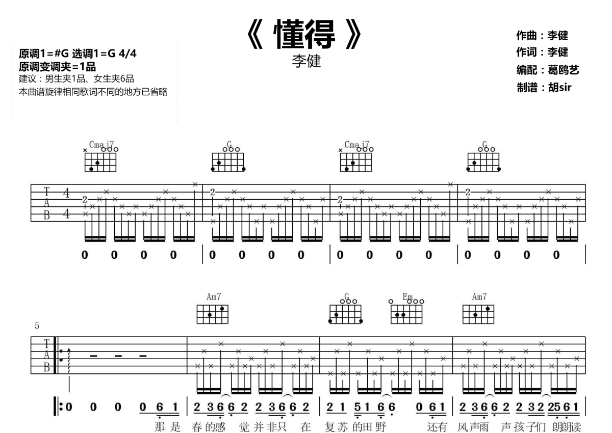 《懂得》是李健演唱的一首歌曲,本吉他谱采用的是G调指法编配,这份吉他谱共有两张高清图谱,图谱由 @胡sir音乐 编配上传,图谱使用六线谱编配,包含吉他和弦指法、简谱以及歌词部分,使用这份懂得吉他谱,可以让你更加方便地掌握这首歌曲的弹唱技巧,快来尝试吧。李健新歌《懂得》,这是每个人都应该好好听的一首歌。李健用诗一样的语言,诚意满满地呈现了一曲人生长卷,唱出我们内心一直追求的那份初心和感动。G调指编配,原调升G调。男生可以变调夹夹第一品唱原调,女生变调夹夹第六品。