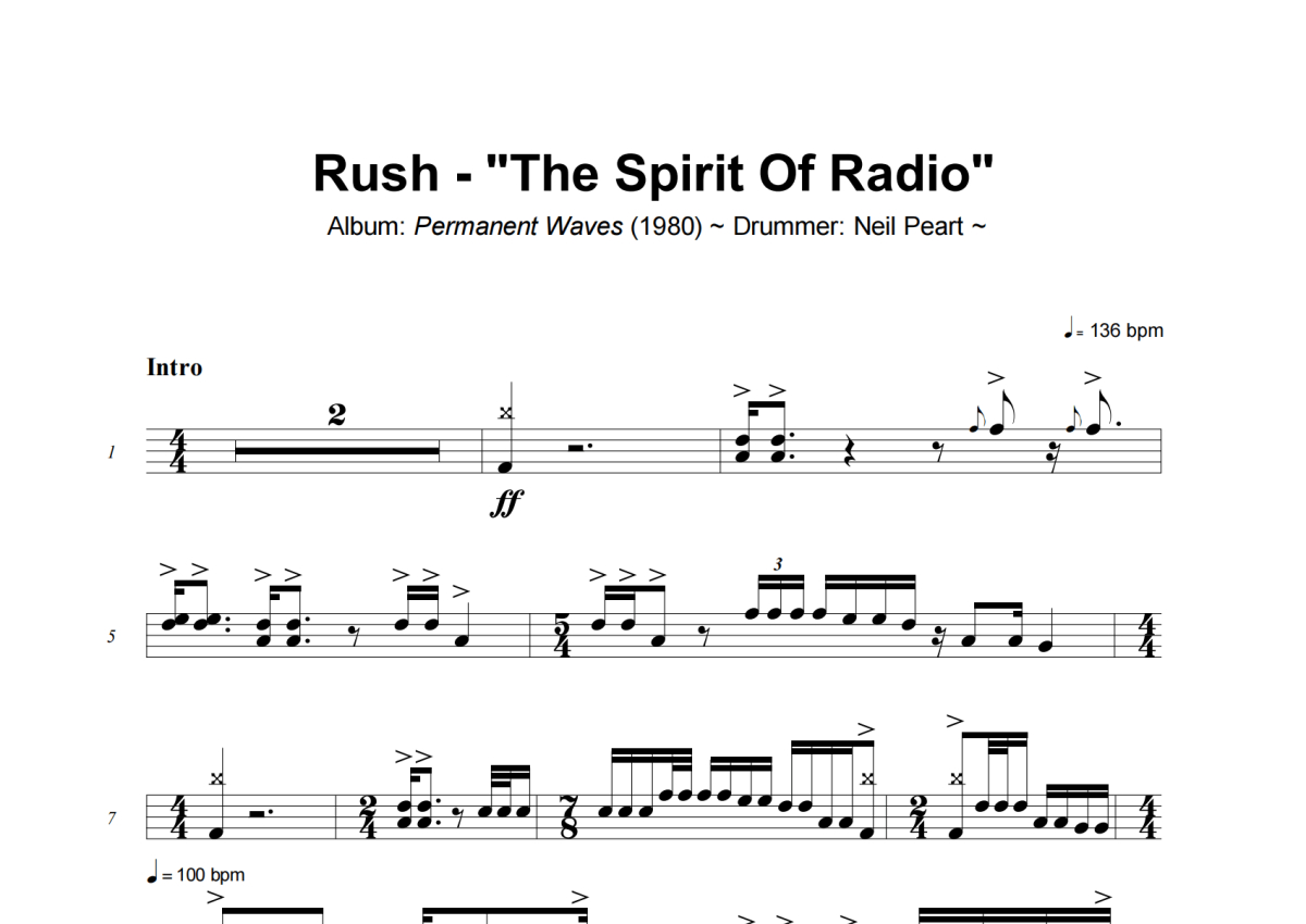 《The Spirit Of Radio》是Rush演唱的一首歌曲,这份架子鼓谱共有七张高清图谱,图谱由 @庄颜 编配上传,图谱使用五线谱编配,使用这份The Spirit Of Radio架子鼓谱,你将能够轻松地敲打出这首Rush的The Spirit Of Radio,快来尝试吧。