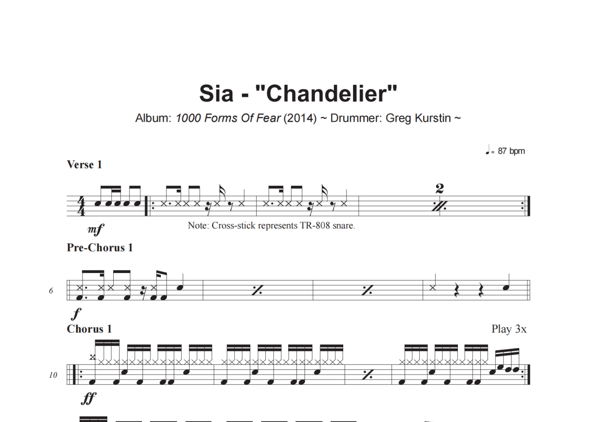 《Chandelier》是Sia演唱的一首歌曲,这份架子鼓谱共有两张高清图谱,图谱由 @庄颜 编配上传,图谱使用五线谱编配,使用这份Chandelier架子鼓谱,你将能够轻松地敲打出这首Sia的Chandelier,快来尝试吧。