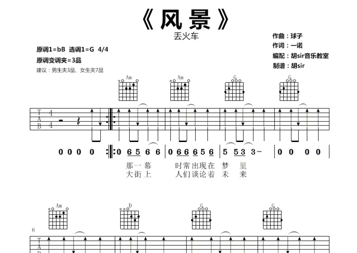 《风景》是丢火车乐队演唱的一首歌曲,本吉他谱采用的是G调指法编配,这份吉他谱共有两张高清图谱,图谱由 @胡sir音乐 编配上传,图谱使用六线谱编配,包含吉他和弦指法、简谱以及歌词部分,使用这份风景吉他谱,可以让你更加方便地掌握这首歌曲的弹唱技巧,快来尝试吧。《我站在桥上看风景》电视剧片头曲《风景》吉他谱,由丢火车乐队作曲并演唱,原调降B调,变调夹夹3品;本谱选调G调指法版,变调夹建议女生夹第七品,男生夹第三品演唱。