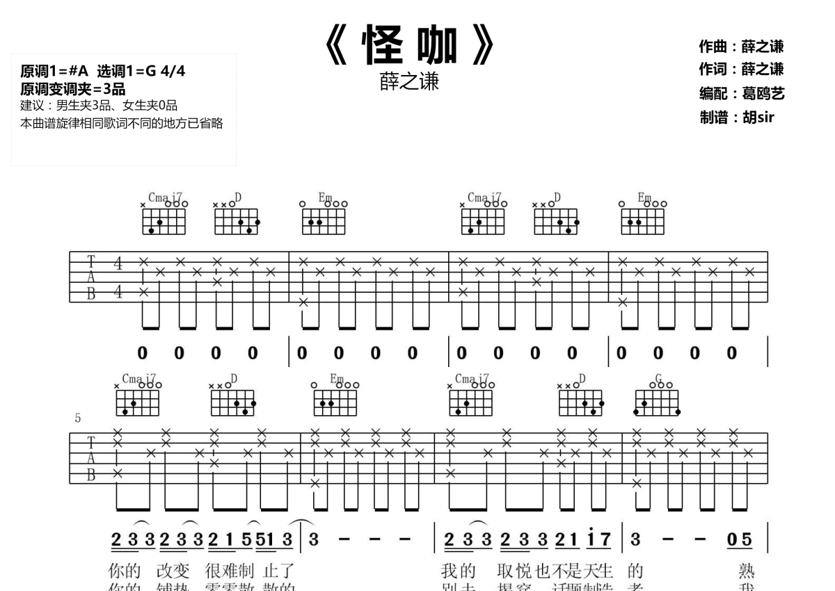 《怪咖》是薛之谦演唱的一首歌曲,本吉他谱采用的是G调指法编配,这份吉他谱共有两张高清图谱,图谱由 @胡sir音乐 编配上传,图谱使用六线谱编配,包含吉他和弦指法、简谱以及歌词部分,使用这份怪咖吉他谱,可以让你更加方便地掌握这首歌曲的弹唱技巧,快来尝试吧。薛之谦《怪咖》吉他谱,原调#A,选调G,原调变调夹夹第三品,女生不用夹,薛之谦在《无限歌谣季》带来的一首原创新歌,感情里的怪咖,再难过也笑着说吧。《怪咖》浅唱轻吟,将爱情里的委曲求全温柔铺垫,演绎了“小丑”微笑面具下隐忍纠结的心酸爱情。