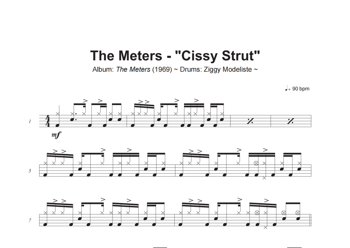 《Cissy Strut》是The Meters演唱的一首歌曲,这份架子鼓谱共有四张高清图谱,图谱由 @庄颜 编配上传,图谱使用五线谱编配,使用这份Cissy Strut架子鼓谱,你将能够轻松地敲打出这首The Meters的Cissy Strut,快来尝试吧。