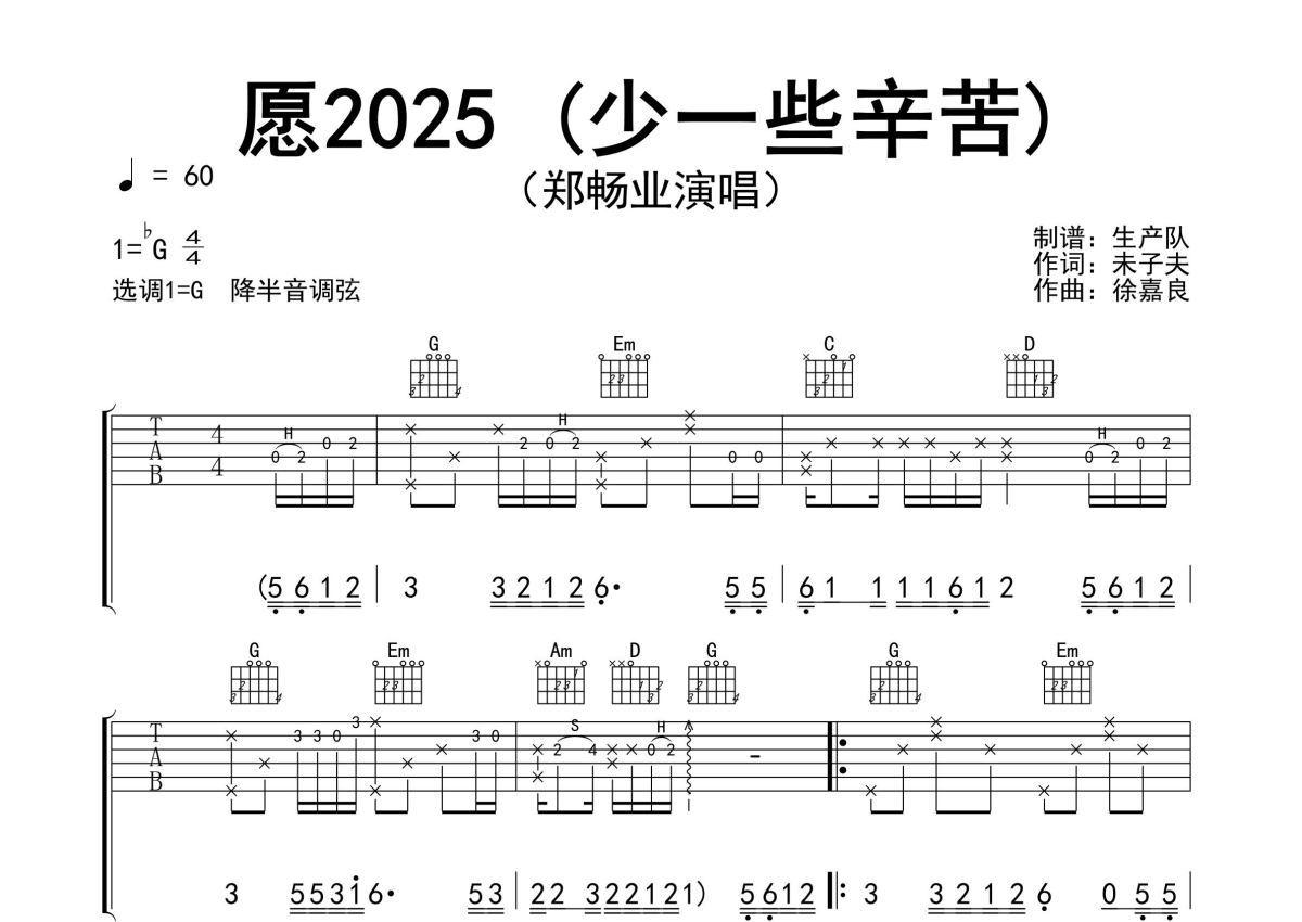 《愿2025 (少一些辛苦)》是郑畅业演唱的一首歌曲,精编完美版,拍号为4/4拍,歌曲速度为每分钟60拍,歌曲原调为Gb调,但由于原调指法比较难,为了方便弹奏,本吉他谱采用的是G调指法编配,降半音调弦弹奏即为原调,当然也可以根据自己的音域决定是否调弦,这份吉他谱共有三张高清图谱,图谱由 @生产队 编配上传,图谱使用六线谱编配,包含吉他和弦指法、简谱以及歌词部分,使用这份愿2025 (少一些辛苦)吉他谱,可以让你更加方便地掌握这首歌曲的弹唱技巧,快来尝试吧。郑畅业演唱的歌曲《愿2025 (少一些辛苦)》原版吉他谱,完整的前奏、间奏、尾奏solo编配。
