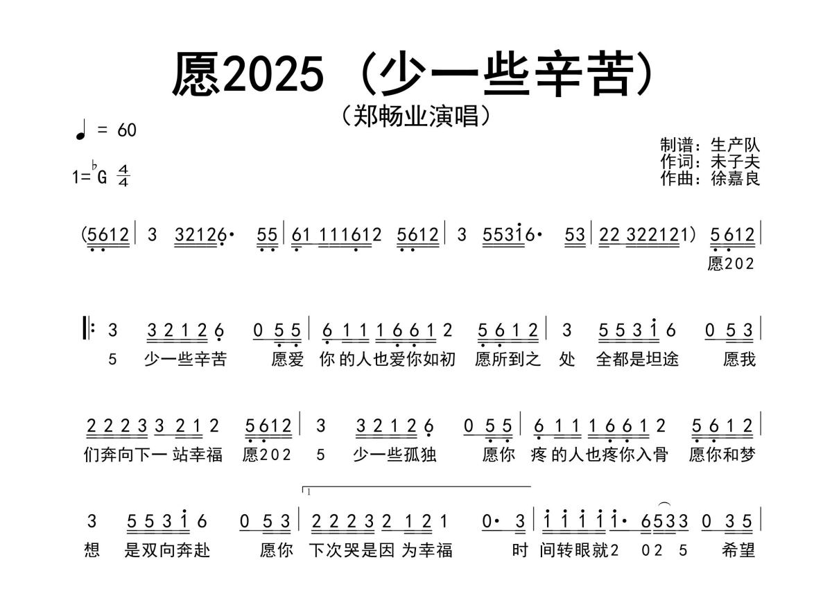 《愿2025 (少一些辛苦)》是郑畅业演唱的一首歌曲,原版简谱,拍号为4/4拍,歌曲速度为每分钟60拍,这份简谱共有一张高清图谱,图谱由 @生产队 编配上传郑畅业演唱的歌曲《愿2025 (少一些辛苦)》原版简谱,完整的前奏、间奏、尾奏solo编配。