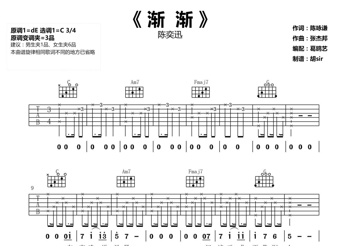 《渐渐》是陈奕迅演唱的一首歌曲,本吉他谱采用的是C调指法编配,这份吉他谱共有三张高清图谱,图谱由 @胡sir音乐 编配上传,图谱使用六线谱编配,包含吉他和弦指法、简谱以及歌词部分,使用这份渐渐吉他谱,可以让你更加方便地掌握这首歌曲的弹唱技巧,快来尝试吧。陈奕迅《渐渐》吉他谱原调降B调,变调夹夹3品;选调C调指法编配,变调夹男生建议夹一品,女生建议夹六品。陈奕迅最新一首粤语歌曲,渐渐六线谱,高清图片谱三张谱例,感谢胡sir音乐教室出品从遗憾到忘记,我只能拜托时间,2018以爱为出发的专辑《L.O.V.E》中的一首慢板情歌,淡淡然的诉说分手后的孤寂,却充满伤感情绪。