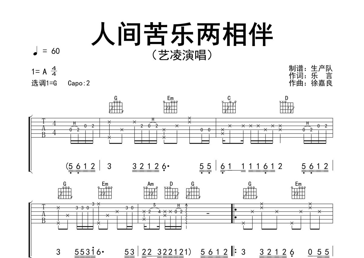 《人间苦乐两相伴》是艺凌演唱的一首歌曲,精编完美版,拍号为4/4拍,歌曲速度为每分钟60拍,歌曲原调为A调,但由于原调指法比较难,为了方便弹奏,本吉他谱采用的是G调指法编配,变调夹2品弹奏即为原调,当然也可以根据自己的音域改变变调夹位置,或者通过改变和弦调性,以方便自己弹奏,这份吉他谱共有三张高清图谱,图谱由 @生产队 编配上传,图谱使用六线谱编配,包含吉他和弦指法、简谱以及歌词部分,使用这份人间苦乐两相伴吉他谱,可以让你更加方便地掌握这首歌曲的弹唱技巧,快来尝试吧。艺凌演唱的歌曲《人间苦乐两相伴》原版吉他谱,完整的前奏、间奏、尾奏solo编配。