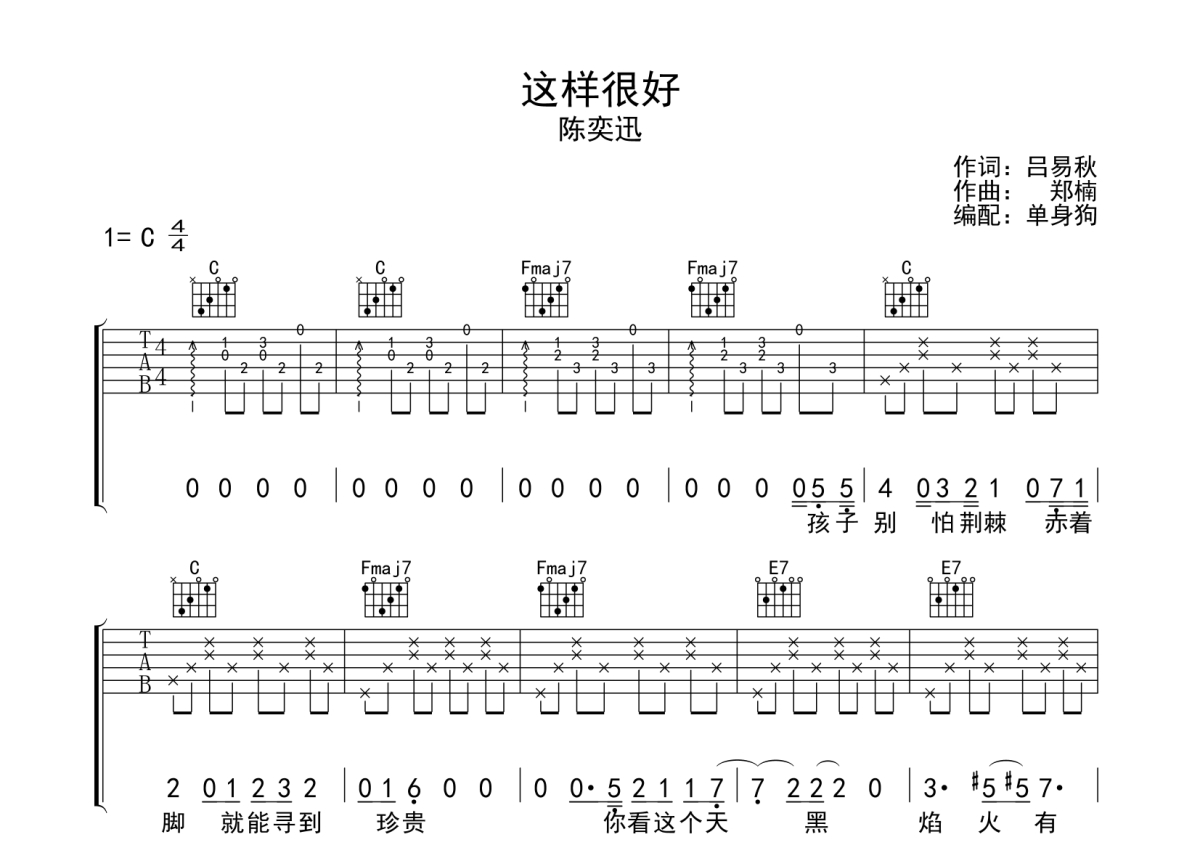 《这样很好》是陈奕迅演唱的一首歌曲,拍号为4/4拍,歌曲原调为C调,本吉他谱采用的是C调指法编配,演奏时不需要使用变调夹即为原调,这份吉他谱共有三张高清图谱,图谱由 @单身狗 编配上传,图谱使用六线谱编配,包含吉他和弦指法、简谱以及歌词部分,使用这份这样很好吉他谱,可以让你更加方便地掌握这首歌曲的弹唱技巧,快来尝试吧。