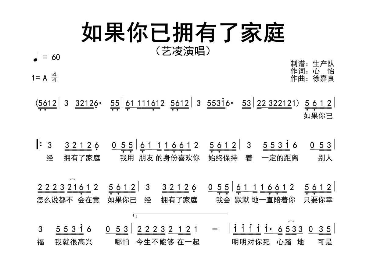 《如果你已拥有了家庭》是艺凌演唱的一首歌曲,原版简谱,拍号为4/4拍,歌曲速度为每分钟60拍,这份简谱共有一张高清图谱,图谱由 @生产队 编配上传艺凌演唱的歌曲《如果你已拥有了家庭》原版简谱,完整的前奏、间奏、尾奏solo编配。