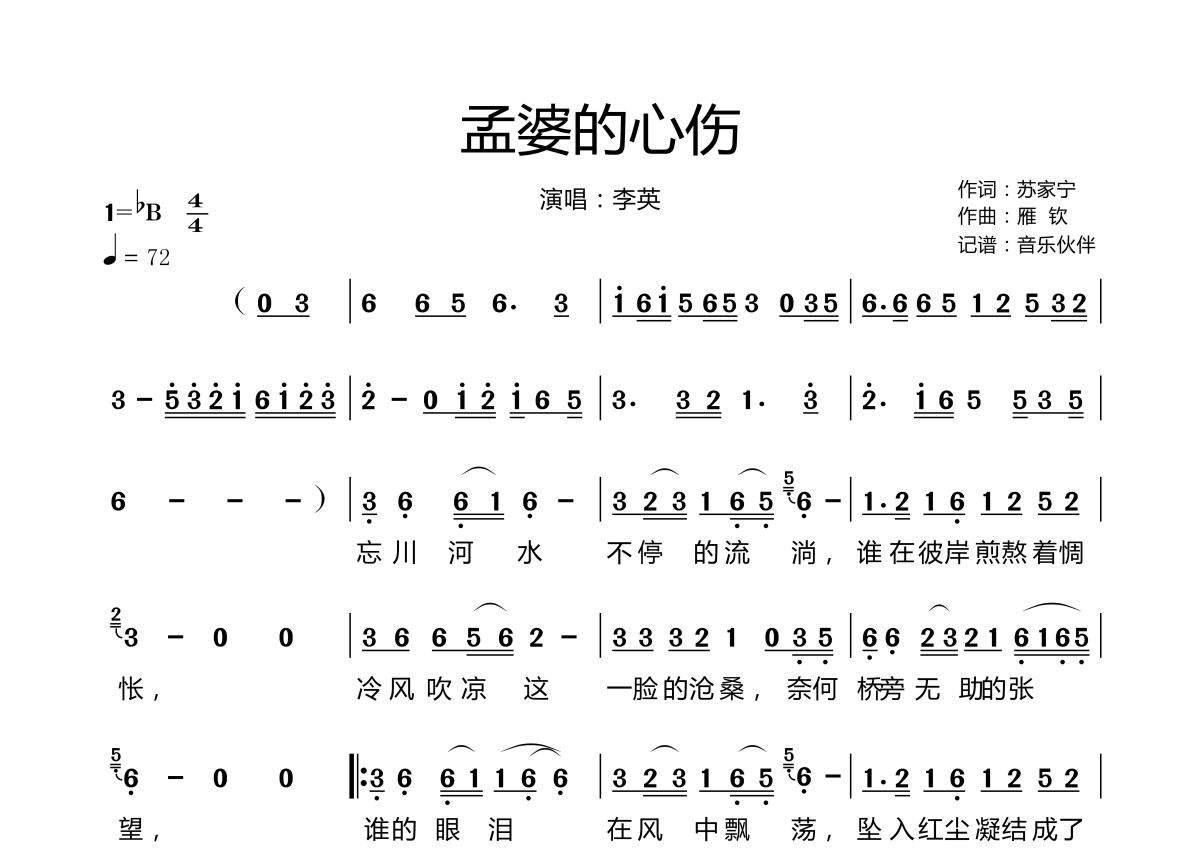 《孟婆的心伤》是李英演唱的一首歌曲,拍号为4/4拍,歌曲速度为每分钟72拍,这份简谱共有两张高清图谱,图谱由 @音乐伙伴 编配上传。