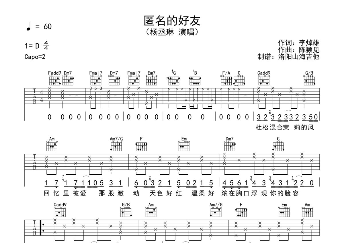 《匿名的好友》是杨丞琳演唱的一首歌曲,本吉他谱采用的是C调指法编配,这份吉他谱共有两张高清图谱,图谱由 @何奔洋 编配上传,图谱使用六线谱编配,包含吉他和弦指法、简谱以及歌词部分,曲谱配备了相关的音频提供试听,使用这份匿名的好友吉他谱,可以让你更加方便地掌握这首歌曲的弹唱技巧,快来尝试吧。
