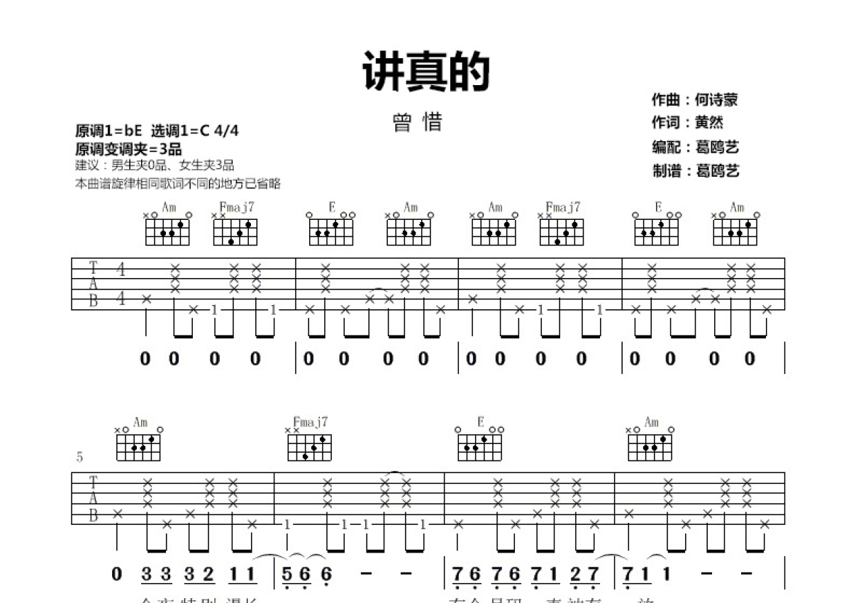 《讲真的》是曾惜演唱的一首歌曲,本吉他谱采用的是C调指法编配,这份吉他谱共有两张高清图谱,图谱由 @胡sir音乐 编配上传,图谱使用六线谱编配,包含吉他和弦指法、简谱以及歌词部分,使用这份讲真的吉他谱,可以让你更加方便地掌握这首歌曲的弹唱技巧,快来尝试吧。曾惜《讲真的》吉他谱,原调bE,选调C,变调夹夹三品。朗朗上口的好听旋律,让人忍不住单曲循环的抖音热门歌曲。清新而又略带伤感的情歌,跃动的节奏感,如彼此的心跳声般,将恋爱中相互喜欢而又不确定的纯真情感完美的呈现了出来,让人深有共鸣。
