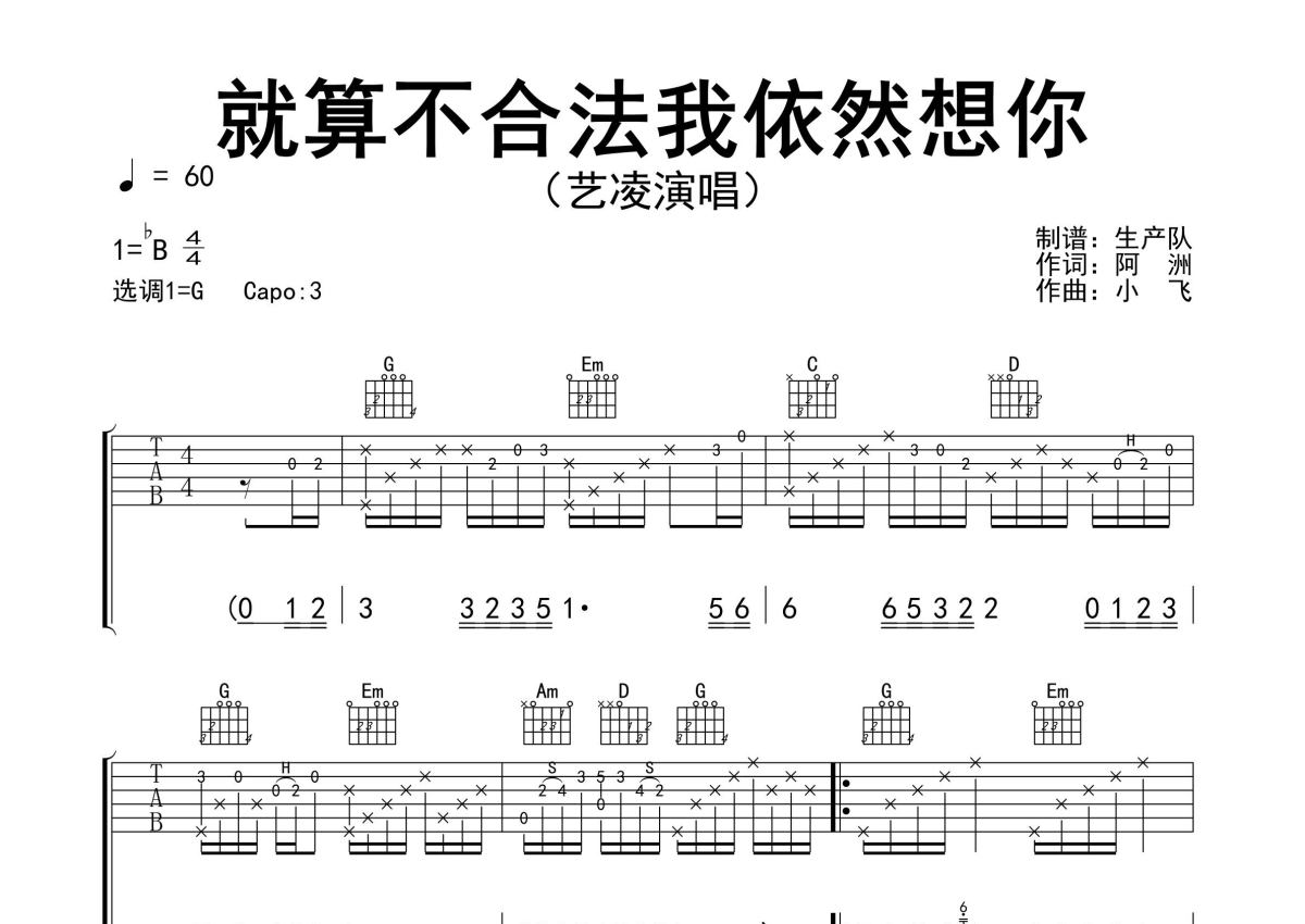 《就算不合法我依然想你》是艺凌演唱的一首歌曲,精编完美版,拍号为4/4拍,歌曲速度为每分钟60拍,歌曲原调为Bb调,但由于原调指法比较难,为了方便弹奏,本吉他谱采用的是G调指法编配,变调夹3品弹奏即为原调,当然也可以根据自己的音域改变变调夹位置,或者通过改变和弦调性,以方便自己弹奏,这份吉他谱共有三张高清图谱,图谱由 @生产队 编配上传,图谱使用六线谱编配,包含吉他和弦指法、简谱以及歌词部分,使用这份就算不合法我依然想你吉他谱,可以让你更加方便地掌握这首歌曲的弹唱技巧,快来尝试吧。艺凌演唱的歌曲《就算不合法我依然想你》原版吉他谱,完整的前奏、间奏、尾奏solo编配,精编完美版。