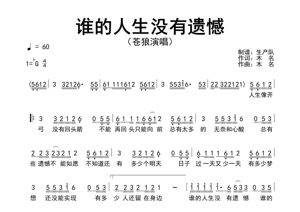 《谁的人生没有遗憾》是苍狼演唱的一首歌曲,原版简谱,拍号为4/4拍,歌曲速度为每分钟60拍,这份简谱共有一张高清图谱,图谱由 @生产队 编配上传苍狼演唱的歌曲《谁的人生没有遗憾》原版简谱,完整的前奏、间奏、尾奏solo编配。