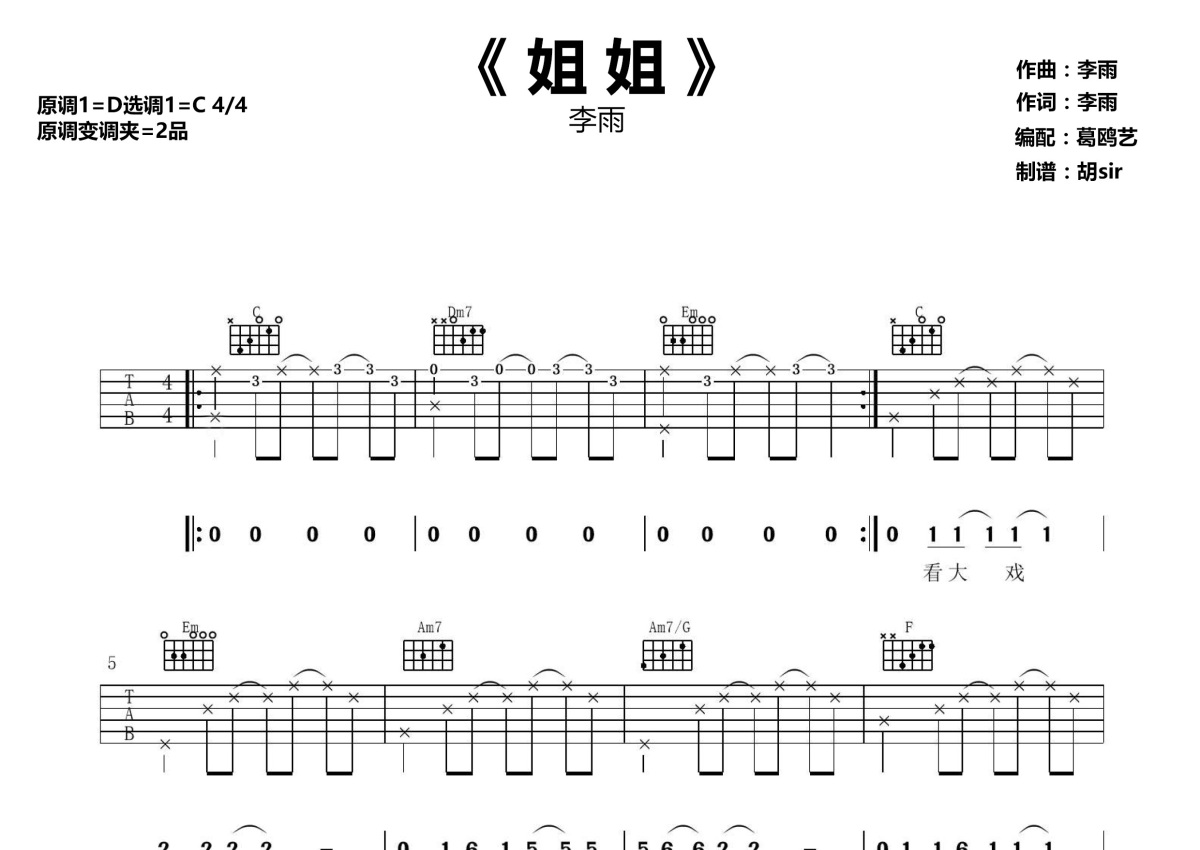 《姐姐》是李雨演唱的一首歌曲,本吉他谱采用的是C调指法编配,这份吉他谱共有三张高清图谱,图谱由 @胡sir音乐 编配上传,图谱使用六线谱编配,包含吉他和弦指法、简谱以及歌词部分,使用这份姐姐吉他谱,可以让你更加方便地掌握这首歌曲的弹唱技巧,快来尝试吧。姐姐吉他谱_李雨_《姐姐》C调简单版弹唱谱;原调为D调,这里采用C调和弦编配,演唱时夹变调夹2品回原调。《姐姐》这首歌是李雨演唱的一首民谣歌曲,从这首歌中我们似是看到童年的影子,又不像是记忆里的样子。竟不知这伤感哪里而来,或许只是在怀念罢了。