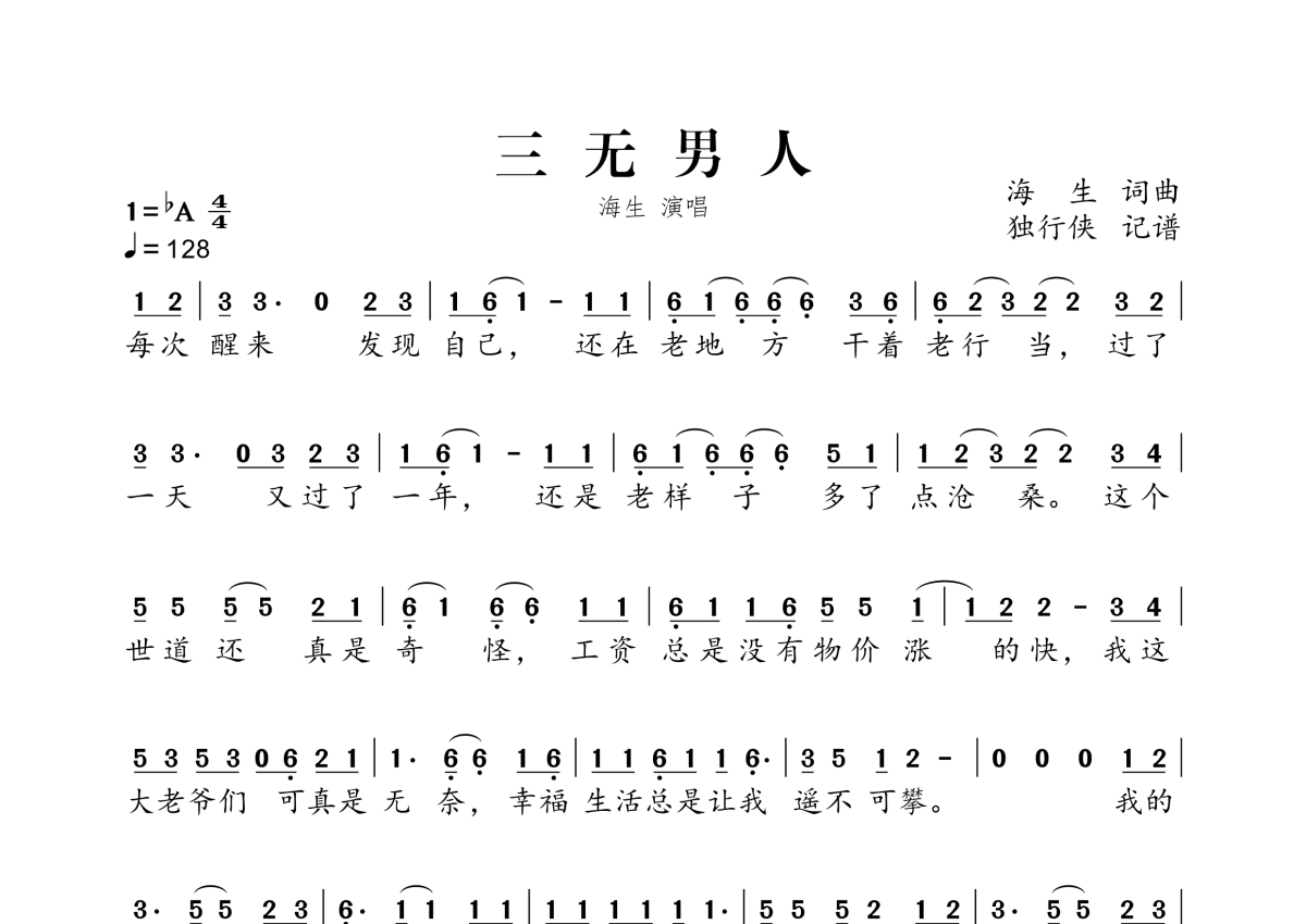 三无男人简谱 - 海生演唱