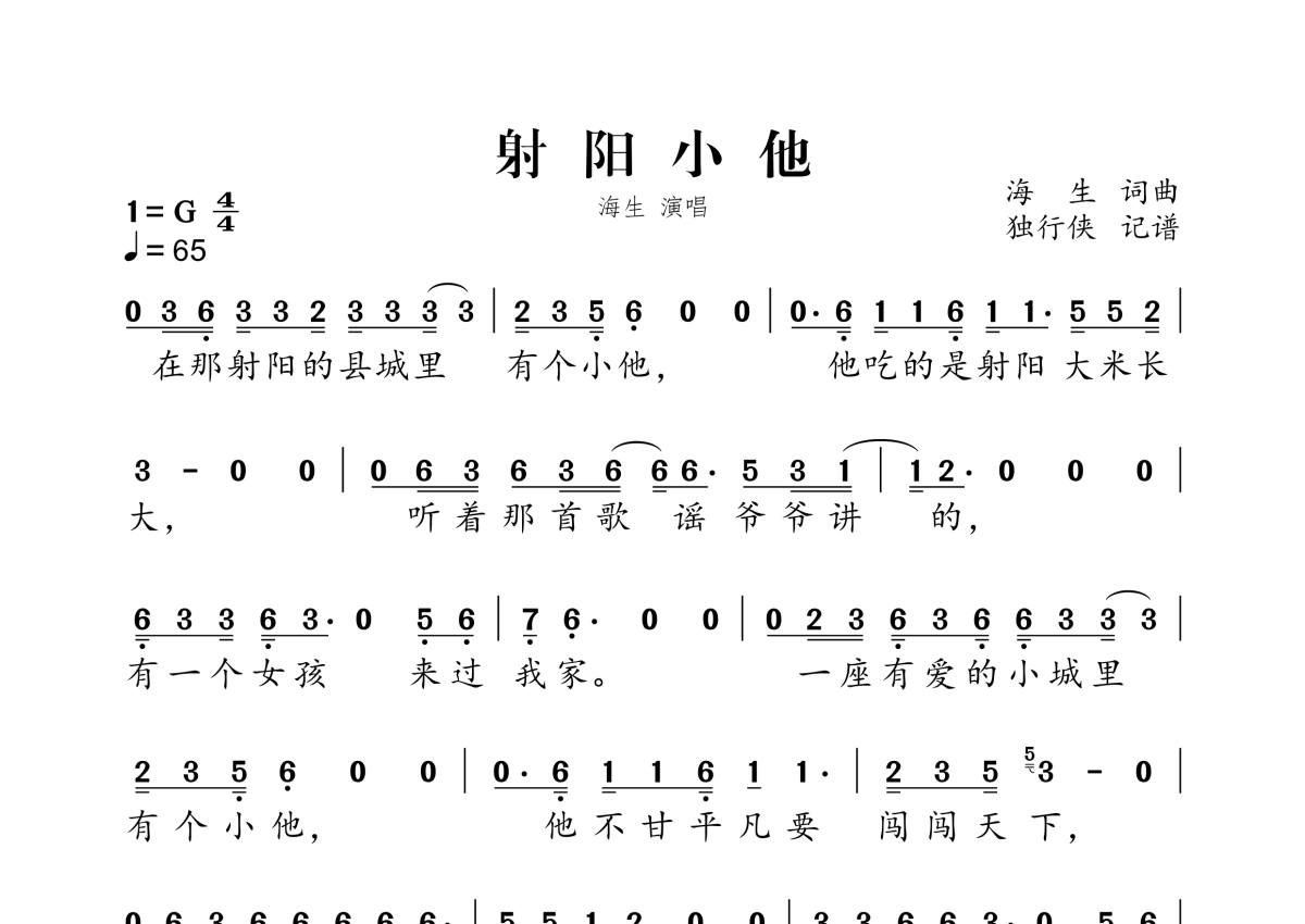 《射阳小他》是海生演唱的一首歌曲,拍号为4/4拍,这份简谱共有一张高清图谱,图谱由 @独行侠 编配上传。