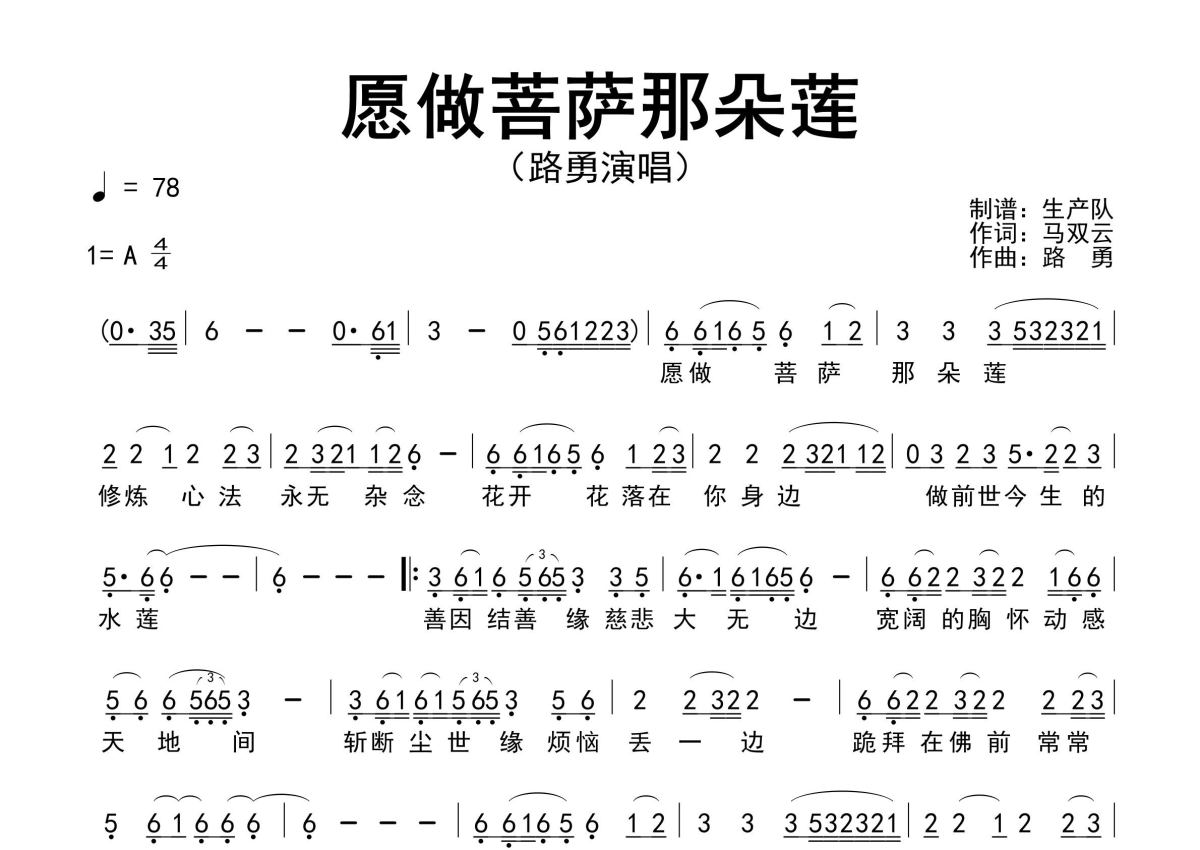 《愿做菩萨那朵莲》是路勇演唱的一首歌曲,原版简谱,拍号为4/4拍,歌曲速度为每分钟78拍,这份简谱共有一张高清图谱,图谱由 @生产队 编配上传路勇演唱的经典歌曲《愿做菩萨那朵莲》原版简谱,完整的前奏、间奏、尾奏solo编配。