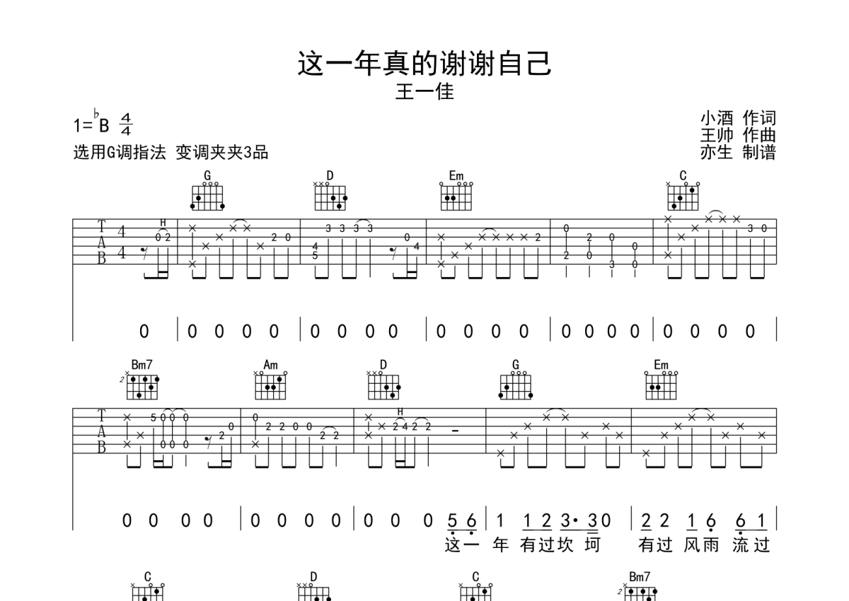 王一佳《这一年真的谢谢自己》吉他谱 - G调弹唱六线谱