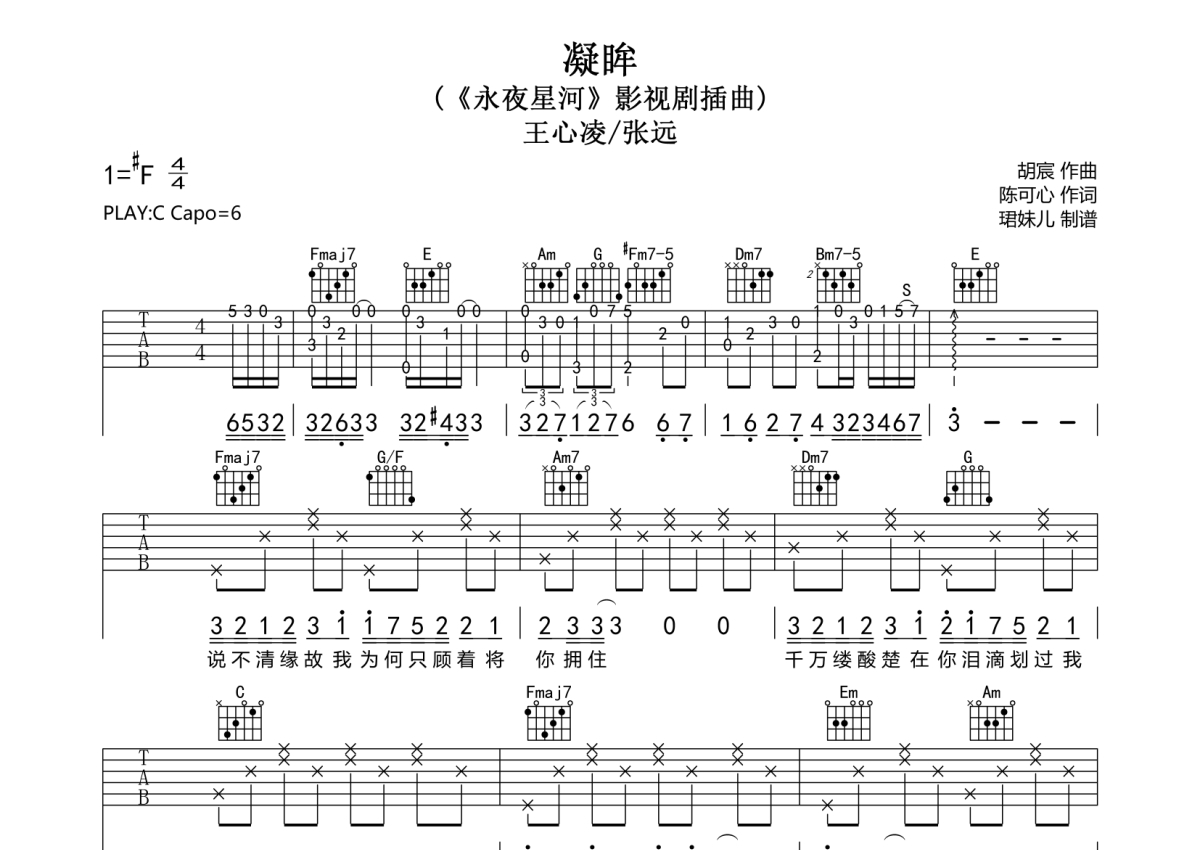 《凝眸》是王心凌 /张远演唱的一首歌曲,拍号为4/4拍,歌曲速度为每分钟85拍,歌曲原调为C调,本吉他谱采用的是C调指法编配,变调夹6品弹奏即为原调,当然也可以根据自己的音域改变变调夹位置,或者通过改变和弦调性,以方便自己弹奏,这份吉他谱共有两张高清图谱,图谱由 @珺妹儿 编配上传,图谱使用六线谱编配,包含吉他和弦指法、简谱以及歌词部分,使用这份凝眸吉他谱,可以让你更加方便地掌握这首歌曲的弹唱技巧,快来尝试吧。