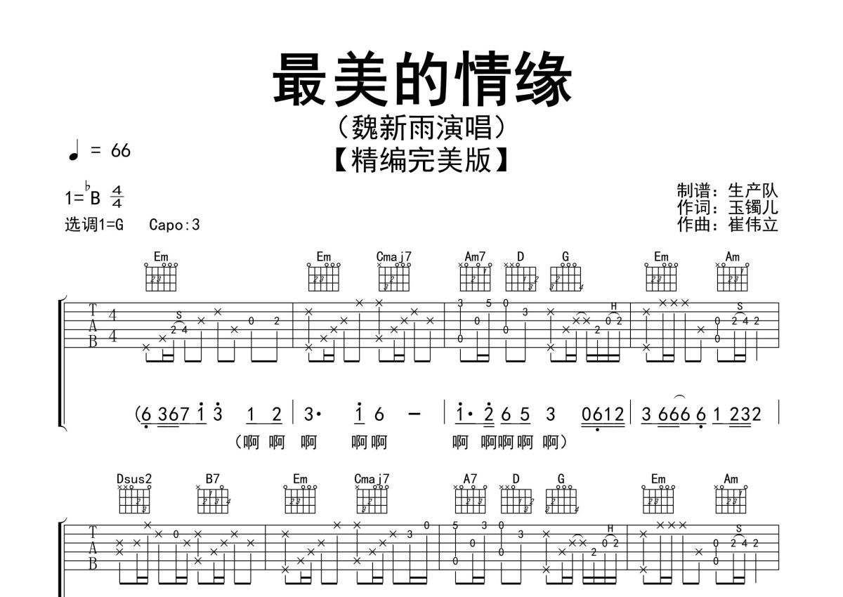 《最美的情缘》是魏新雨演唱的一首歌曲,精编完美版,拍号为4/4拍,歌曲速度为每分钟66拍,歌曲原调为Bb调,但由于原调指法比较难,为了方便弹奏,本吉他谱采用的是G调指法编配,变调夹3品弹奏即为原调,当然也可以根据自己的音域改变变调夹位置,或者通过改变和弦调性,以方便自己弹奏,这份吉他谱共有三张高清图谱,图谱由 @生产队 编配上传,图谱使用六线谱编配,包含吉他和弦指法、简谱以及歌词部分,使用这份最美的情缘吉他谱,可以让你更加方便地掌握这首歌曲的弹唱技巧,快来尝试吧。魏新雨演唱的经典歌曲《最美的情缘》原版吉他谱,完整的前奏、间奏solo编配,精编完美版,怀旧经典!。