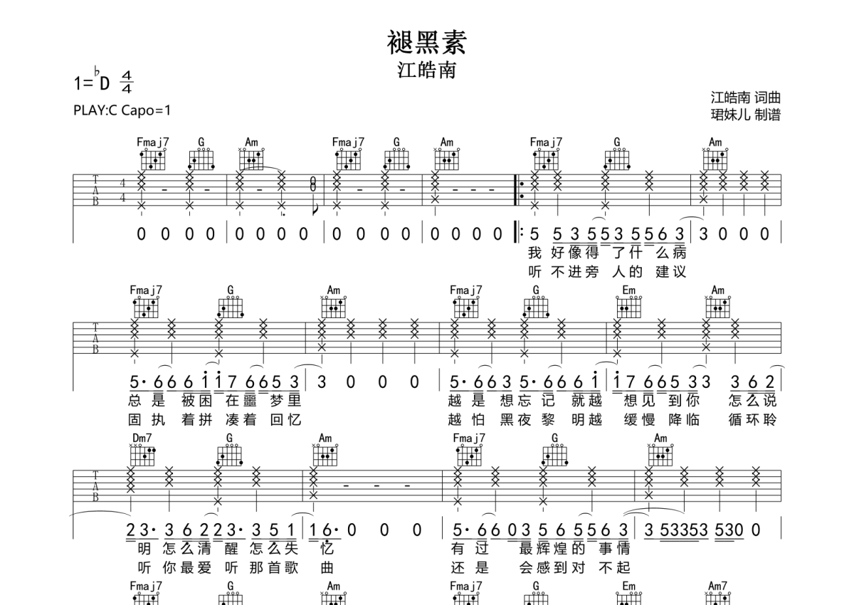 《褪黑素》是江皓南演唱的一首歌曲,拍号为4/4拍,歌曲速度为每分钟83拍,歌曲原调为C调,本吉他谱采用的是C调指法编配,变调夹1品弹奏即为原调,当然也可以根据自己的音域改变变调夹位置,或者通过改变和弦调性,以方便自己弹奏,这份吉他谱共有两张高清图谱,图谱由 @珺妹儿 编配上传,图谱使用六线谱编配,包含吉他和弦指法、简谱以及歌词部分,使用这份褪黑素吉他谱,可以让你更加方便地掌握这首歌曲的弹唱技巧,快来尝试吧。