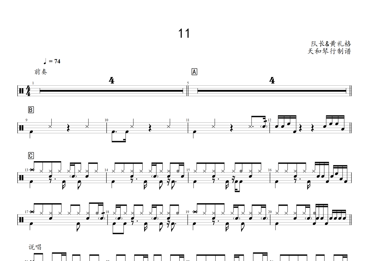 《11》是队长、黄礼格演唱的一首歌曲,拍号为4/4拍,歌曲速度为每分钟74拍,这份架子鼓谱共有两张高清图谱,图谱由 @音符喷血者 编配上传,图谱使用五线谱编配,使用这份11架子鼓谱,你将能够轻松地敲打出这首队长、黄礼格的11,快来尝试吧。
