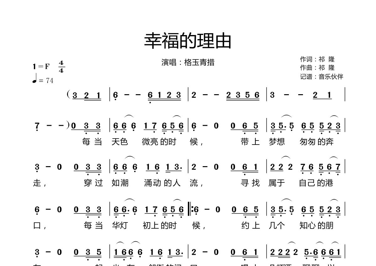 《幸福的理由》是格玉青措演唱的一首歌曲,拍号为4/4拍,歌曲速度为每分钟74拍,这份简谱共有两张高清图谱,图谱由 @音乐伙伴 编配上传。