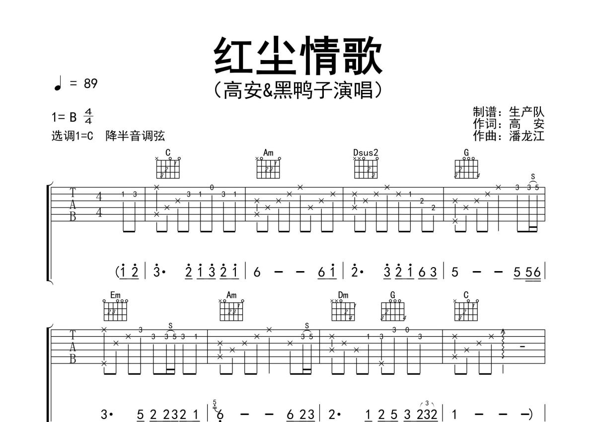 《红尘情歌》是高安&黑鸭子演唱的一首歌曲,精编完美版,拍号为4/4拍,歌曲速度为每分钟89拍,歌曲原调为B调,但由于原调指法比较难,为了方便弹奏,本吉他谱采用的是C调指法编配,降半音调弦弹奏即为原调,当然也可以根据自己的音域决定是否调弦,这份吉他谱共有三张高清图谱,图谱由 @生产队 编配上传,图谱使用六线谱编配,包含吉他和弦指法、简谱以及歌词部分,使用这份红尘情歌吉他谱,可以让你更加方便地掌握这首歌曲的弹唱技巧,快来尝试吧。高安&黑鸭子演唱的经典歌曲《红尘情歌》原版吉他谱,完整的前奏、间奏、尾奏solo编配,精编完美版,致敬经典!。
