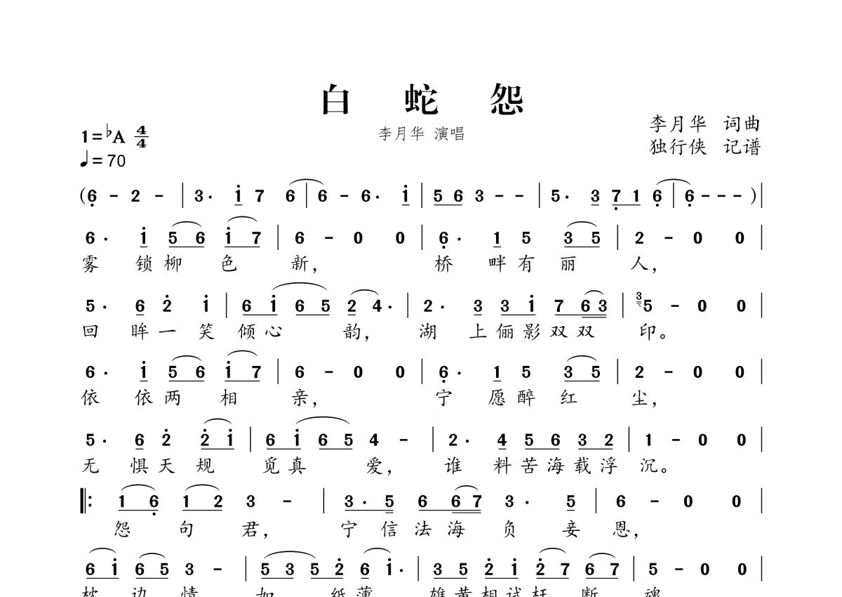 白蛇怨简谱 - 李月华演唱
