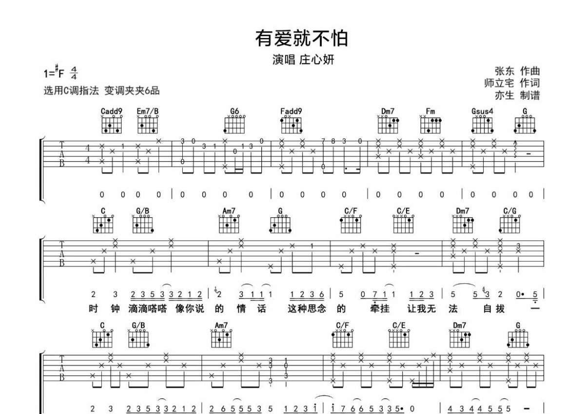 《有爱就不怕》是庄心妍演唱的一首歌曲,拍号为4/4拍,歌曲原调为Gb调,但由于原调指法比较难,为了方便弹奏,本吉他谱采用的是C调指法编配,变调夹6品弹奏即为原调,当然也可以根据自己的音域改变变调夹位置,或者通过改变和弦调性,以方便自己弹奏,这份吉他谱共有两张高清图谱,图谱由 @亦生 编配上传,图谱使用六线谱编配,包含吉他和弦指法、简谱以及歌词部分,使用这份有爱就不怕吉他谱,可以让你更加方便地掌握这首歌曲的弹唱技巧,快来尝试吧。